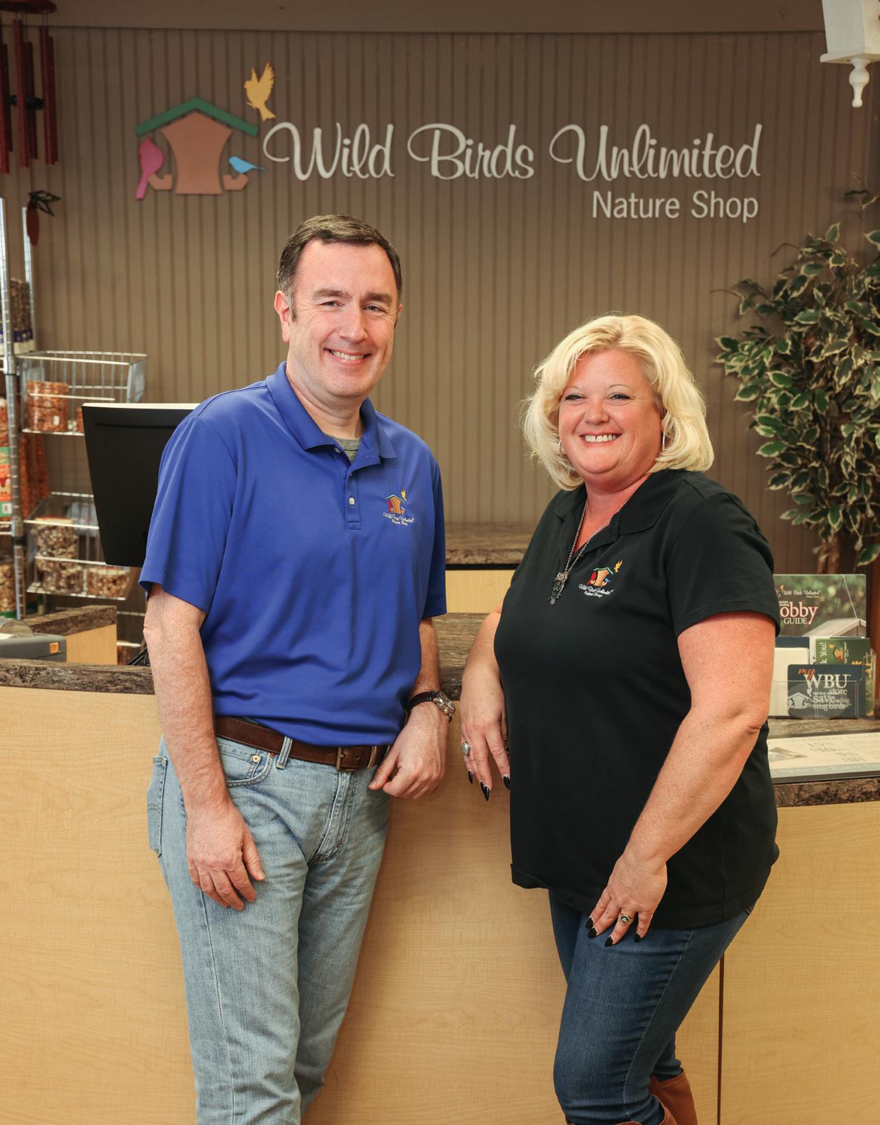 Pictured–Sean and Store Manager Tina Johnson welcome you to Hickory’s bird watch ers paradise, Wild Birds Unlimited.