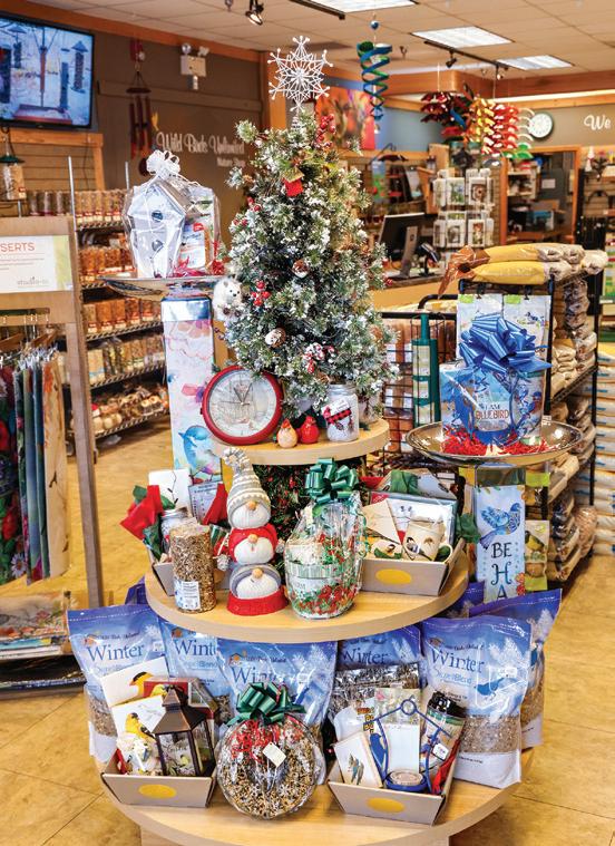 When customers enter the store, they immediately see a relaxing, pleasant environment displaying a variety of food, feeders, accessories, books, and gifts related to backyard bird ing and wild birds. The team of five staff at the store love it when people stop in to talk about birds and create an envi ronment at home for these precious creatures.