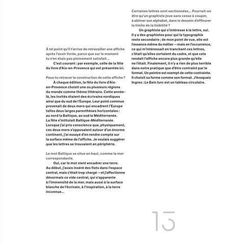 Certaines lettres sont sectionnées… Pourrait-on dire qu’un graphiste joue sans cesse à couper, à abîmer son alphabet, dans le dessein d’effleurer la limite de la lisibilité ? Un graphiste qui s’intéresse à la lettre, oui. Il y a des graphistes pour qui la typographie reste secondaire ; de mon point de vue, elle est l’essence même du métier — mais en l’occurrence, À tel point qu’il t’arrive de retravailler une affiche