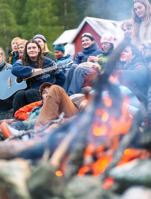 Our dining hall is spacious and bright, with a view over the Sognefjord. In the same building, you’ll find the fireplace lounge — a cozy place to relax and gather around the fire in the evenings. Our school kitchen is modern and wellequipped. The gym hall includes a stage used for student evenings, a strength room, and a fitness room. In our apple garden, you’ll find an outdoor amphitheater with a fire pit and two hot tubs that can be heated up for cold winter days. Here you can hang up a hammock or balance on the slackline. Our outdoor areas also include a sand volleyball court and an artificial turf field with floodlights — which turns into an ice rink when it’s cold enough. Down by the fjord, you’ll find our pier, where students can swim all year round. There’s also a boathouse with both kayaks and canoes available for student use. The school also has a bike and ski workshop, a sewing room with new sewing machines, and its own vegetable garden. We also have a music room where students are free to use the school’s instruments.