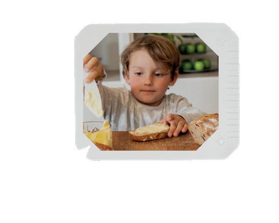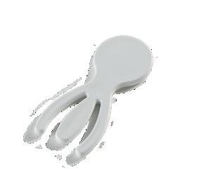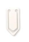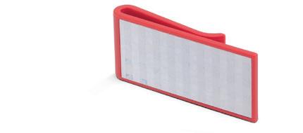 Smart fridge magnet with flip function. Press the ”handle” and the magnet lifts from the surface and it’s easy to put paper under. White hard plastic.