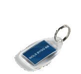 Classic transparent plastic Keychains. The printing is applied to the insert paper that is mounted under the plastic. 4-colour printing included.