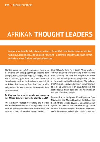 AFRIKAN THOUGHT LEADERS Complex, culturally rich, diverse, uniquely beautiful, indefinable, exotic, spirited, humorous, challenged, and solution-focussed – a plethora of other adjectives comes to the fore when Afrikan design is discussed.