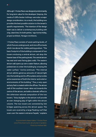 Although 1 Protea Place was designed predominantly for long term value for the developer Zenprop, the needs of Cliffe Decker Hofmeyr were also a major design consideration. As a result, the building now provides the best possible solution to the tenant’s specific requirements. “The intention of the design team was to deliver a contemporary building with crisp, clean lines, for both parties,” says Korina Holley, project architect, Paragon Architects. 1 Protea Place consists of seven parking levels, of which five are underground, and nine office levels which rise above the visible parking podium. “The basic footprint of the building is composed of two towers enclosing a central atrium, set atop the heavier base of the parking levels. The central atrium has east and west facing glass walls. The eastern atrium wall opens up over a water feature, allowing pedestrians to enter the building by crossing the water surface.” Korina continues: “The internal atrium admits generous amounts of natural light into the building and its office plates and provides active awareness of both the interior and exterior environments of the building.” Thus, a very open and airy feel is created within the offices. The atrium wall of the southern tower rakes out towards the centre of the atrium, and adds a dramatic effect to the otherwise rational composition of the two towers. “Strip skylights in the atrium roof provide an ever changing play of light within the atrium volume. The two towers are connected by link bridges spanning across the atrium space. The towers are covered by a large floating roof that soars over the eastern entrance façade,” explains