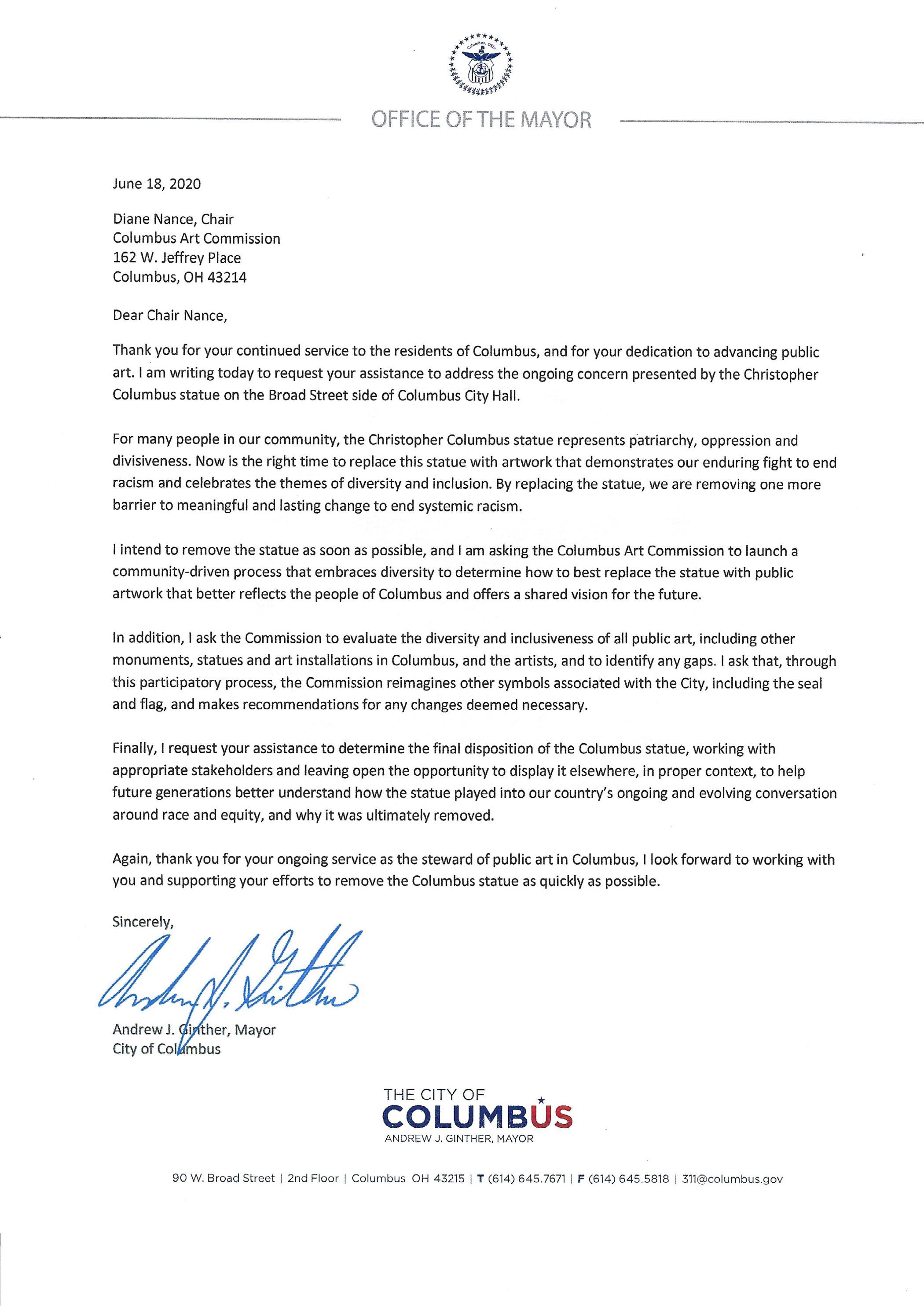 FIGURE 3.6. Scan of Mayor Andrew Ginther’s letter to the Columbus Art Commission, June 18, 2020.