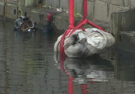 FIGURE 4.5. "Christopher Columbus Statue Pulled From Water In Baltimore." CBS 13WJZ. Still image from video footage, July 6, 2020. https://www.youtube.com/watch?v=bFdjWNYJ6ek