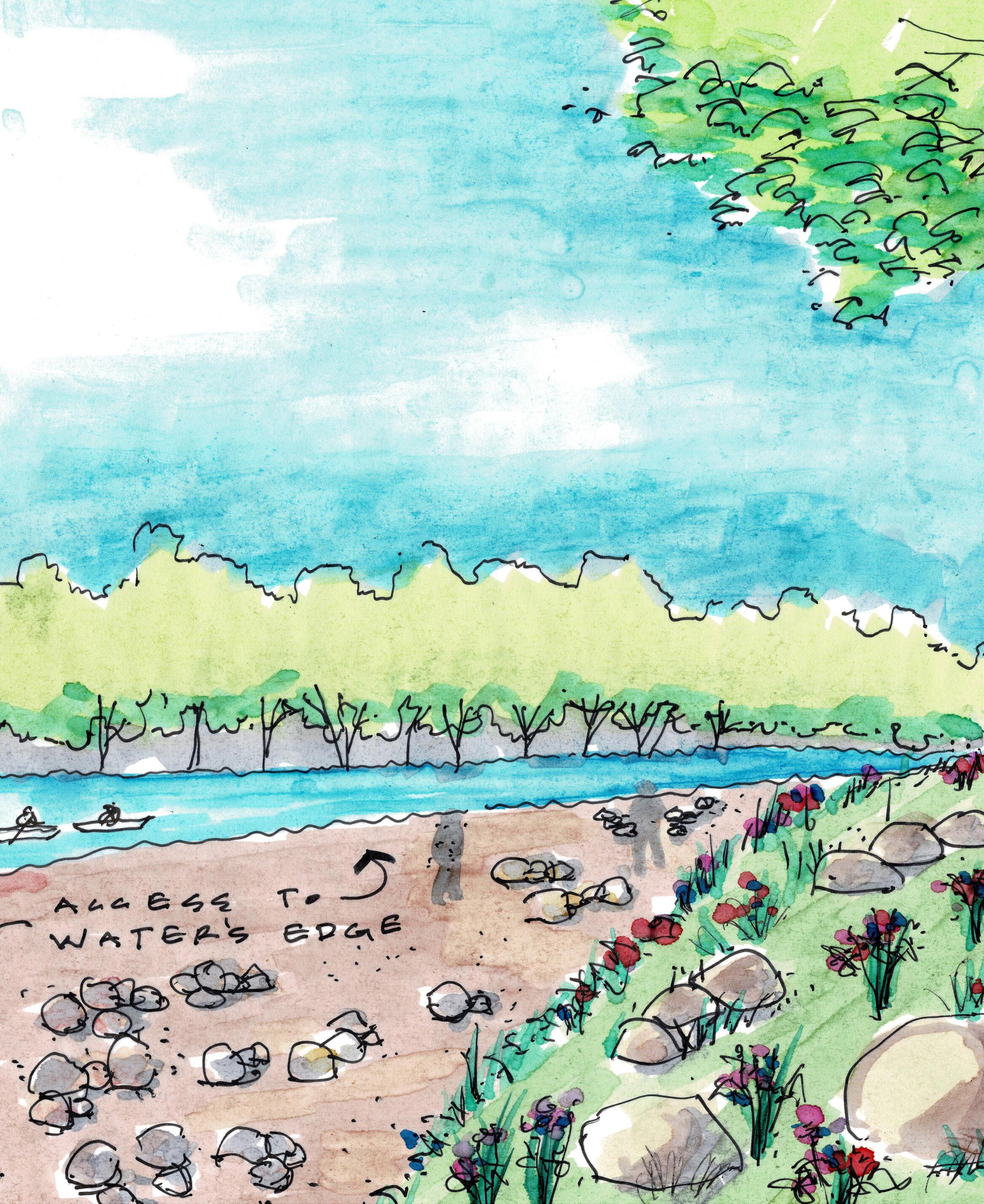 The proposed space was envisioned as a circle or ellipse into which visitors enter from the east and circulate upwards in a clockwise spiral, taking excursions as desired to experience the statue, the river, gardens with native plantings, and other offerings. Key moments radiate out from an outdoor community gathering space to river access in the east and gardens to the north; multi-use public trails connect this place to other Columbus destinations.