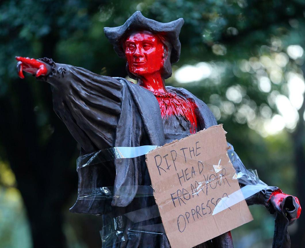 FIGURE 4.3. Conley, Elizabeth, Houston Chronicle, June 11, 2020. https://www.facebook.com/houstonchronicle/photos/a-statue-of-christopher-columbus-holds-a-sign-and-is-painted-red-at-bell-parkin/1661151997378072/?paipv=0&eav=AfbQqDsV42yvxEymSE8chg-2j8b04mlAJPOtGQflhmh3MaCPf-VItxL9qhUvuo-vHyw&_rdr