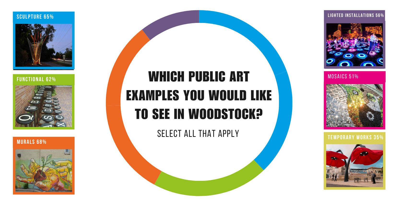 Throughout the process of developing this plan, more than 400 residents participated in a digital survey regarding the future of public art in Woodstock, 14 stakeholders were interviewed, and 10 people participated as steering committee members. Beyond these direct engagement measures, individuals were approached during targeted events, such as a Public Art Happy Hour, and wellloved classics, such as the existing summer parks programming, summer concert series, and farmers markets. The following is a snapshot of survey responses.
