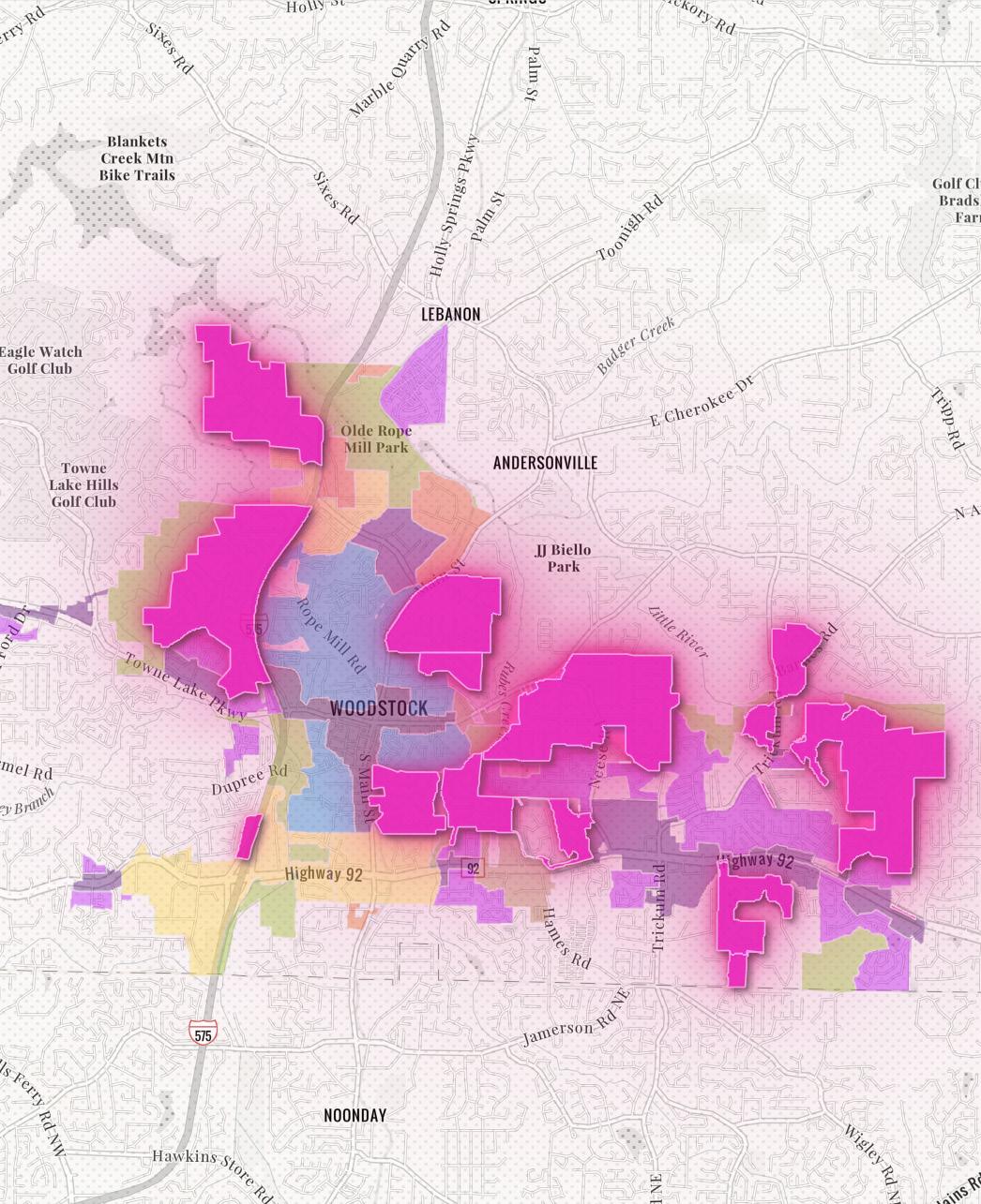 Woodstock’s Neighborhood Living areas, which are characterized by traditional residential developments with close proximity to commercial and mixed-use spaces, provide ample opportunity for public art to enhance community identity, foster social connection, and contribute to a vibrant living experience.