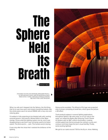 Concealed cove lines and individually addressable fixtures— run with pixel-level control—wash the performance bowl’s ribbed arches in amber, making the architecture itself the light show. Photo credit: Randy Reid