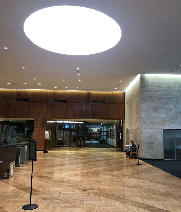 Levia explained that there were many challenges designing the lighting with this LEED Platinum building, the most obvious being the huge amount of daylight coming through the large floor-to-ceiling display windows--think of a rectangle with two sides consisting completely of windows.