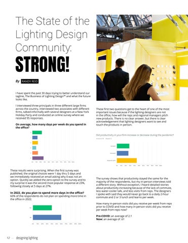 These first two questions get to the heart of one of the most important issues because if the lighting designers are not in the office, how will the reps and regional managers pitch new products. There is no clear answer, but there is clear acknowledgement that lighting designers want to see and touch the products in person.