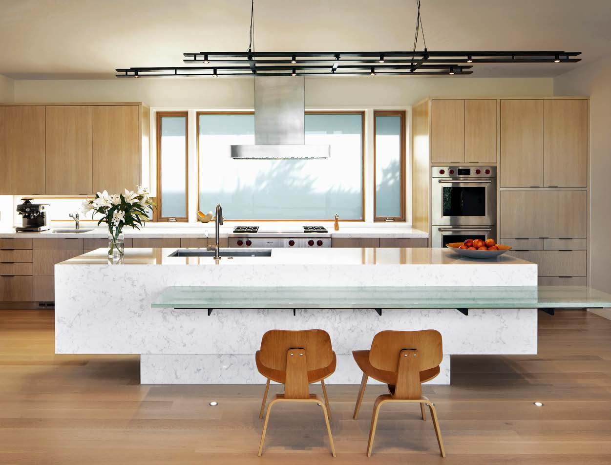 confess that I love the idea of drawing with light and creating lines in space that are formed by light,” he explains. “In the Venice House, we have these two parallel, very thin steel plates that have the MR 11 LED lights tucked up into them. They’re slightly offset, which actually mimics or reflects the design of the kitchen island. Then there’s a cast glass plane, which forms a breakfast table, that’s also offset from the shape of the island itself. So starting from the bottom you have this stone piece with this offset plane of glass and then you go up to the light fixture and there are these two offset bands of steel that have these lines of light in them.”