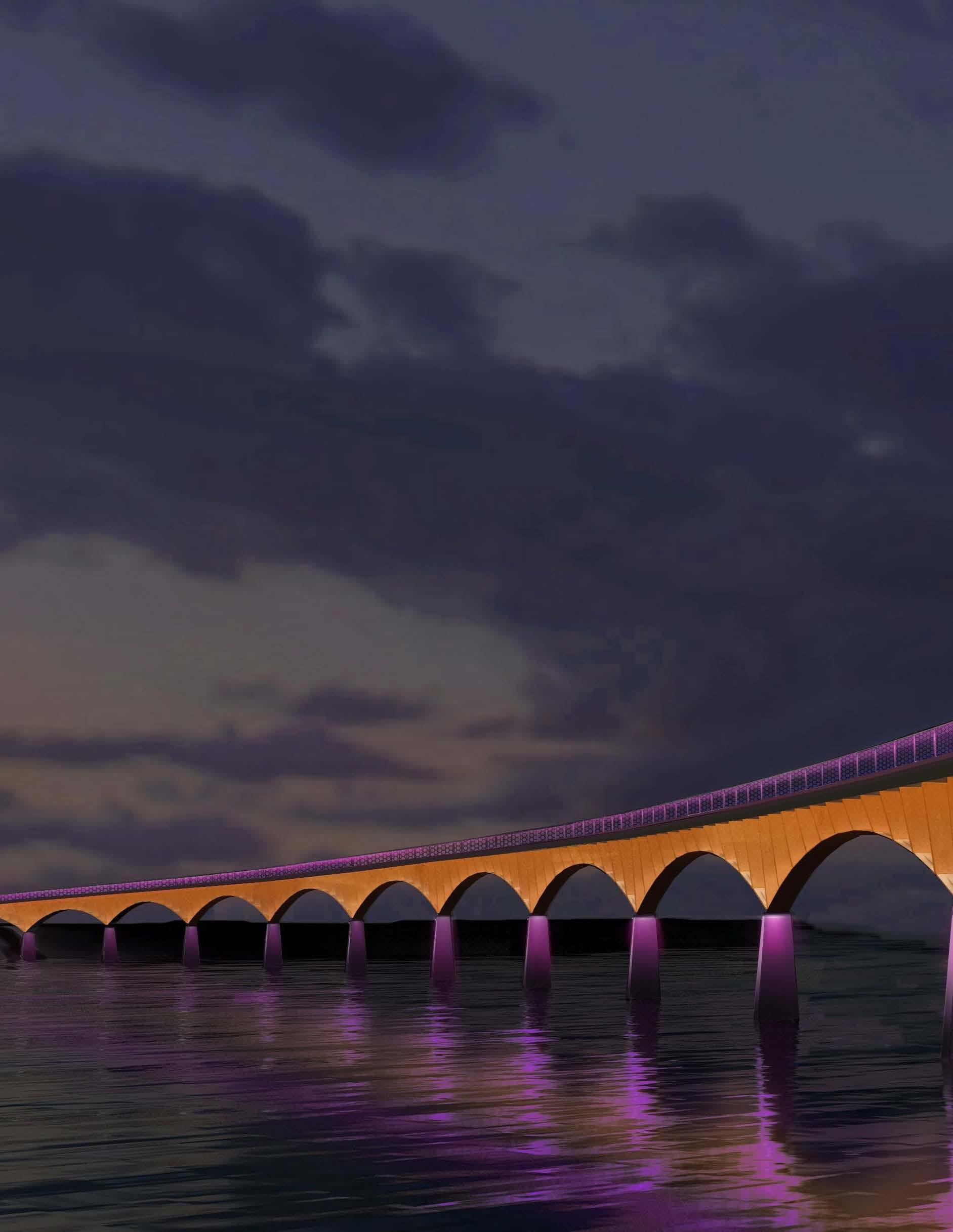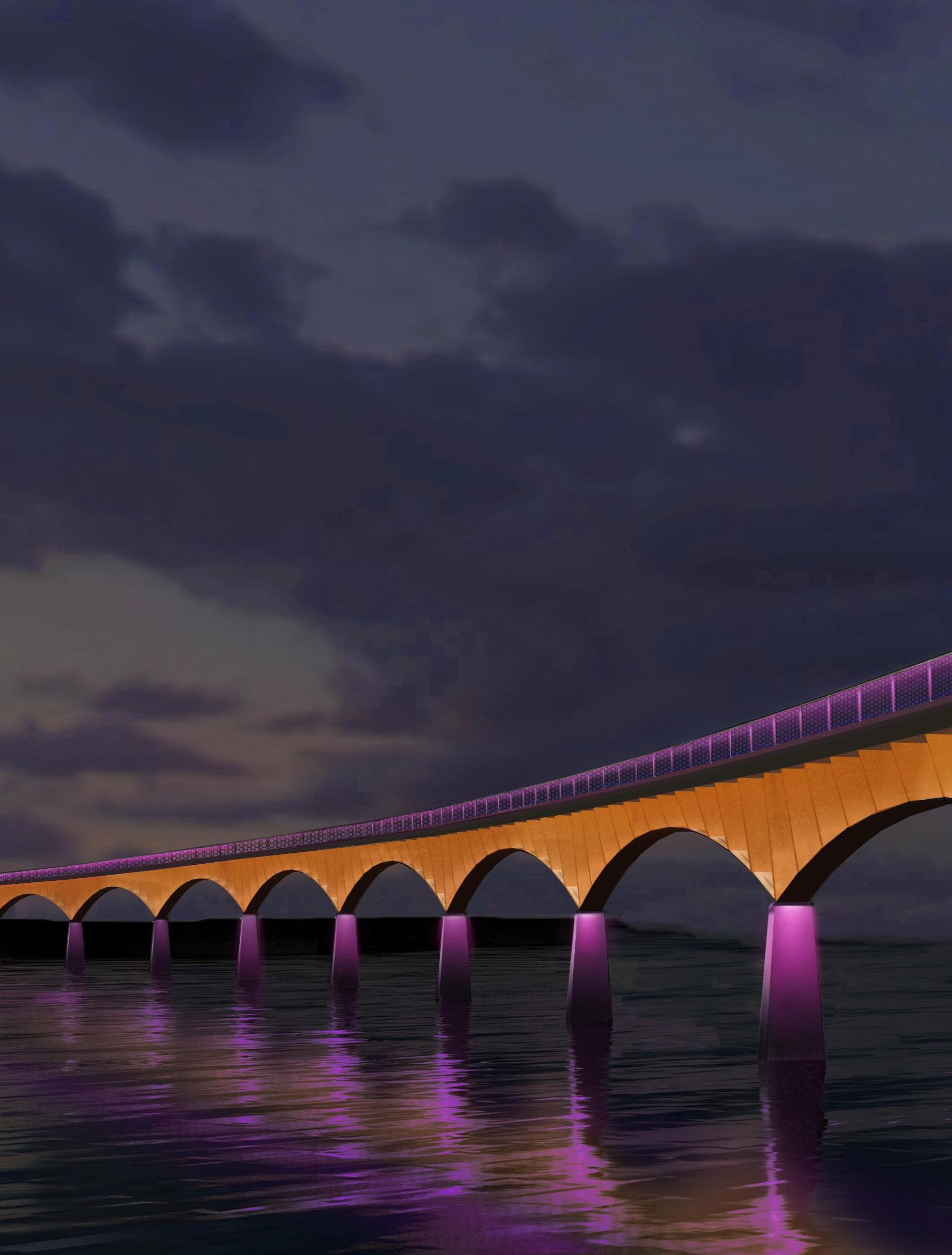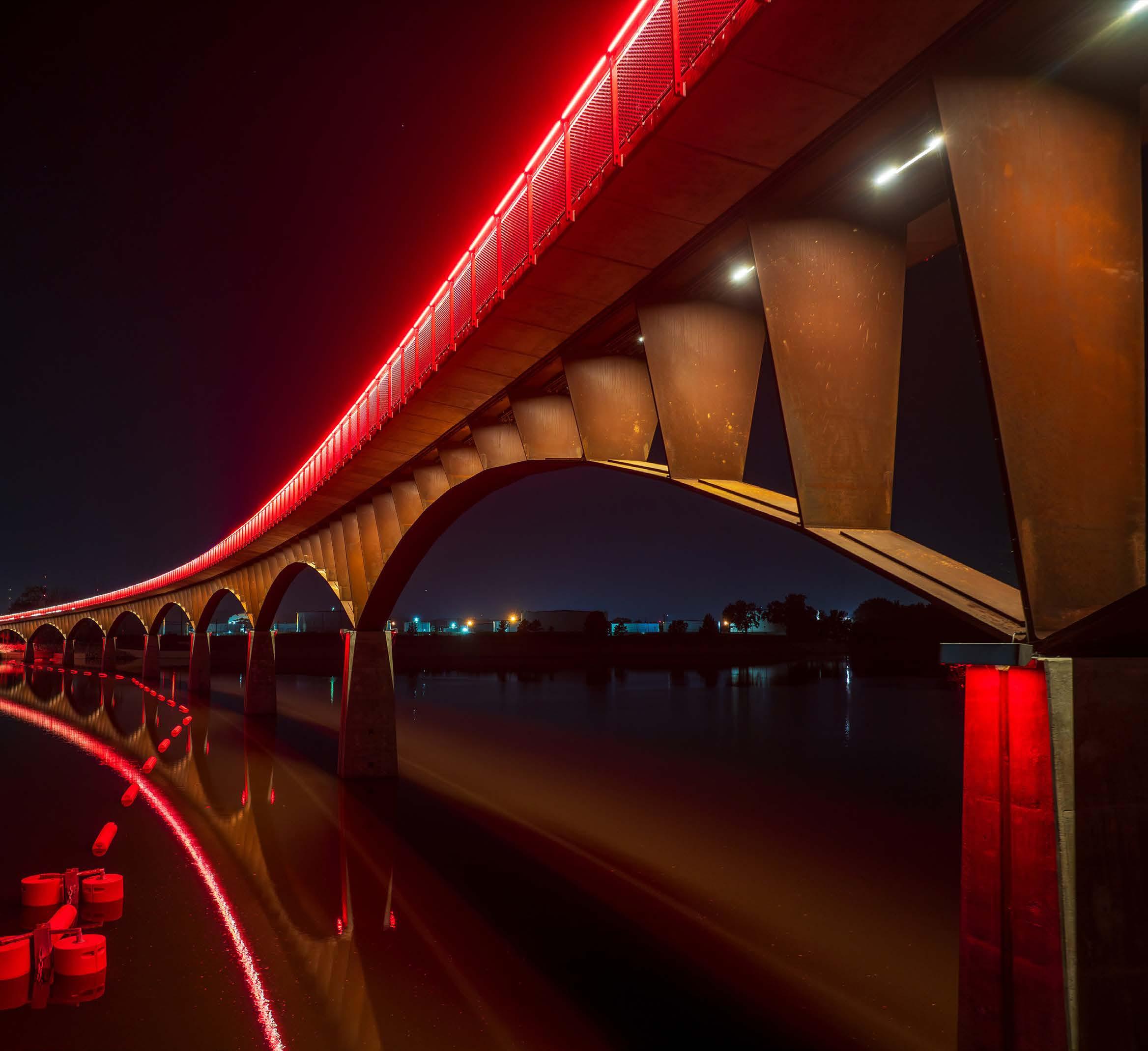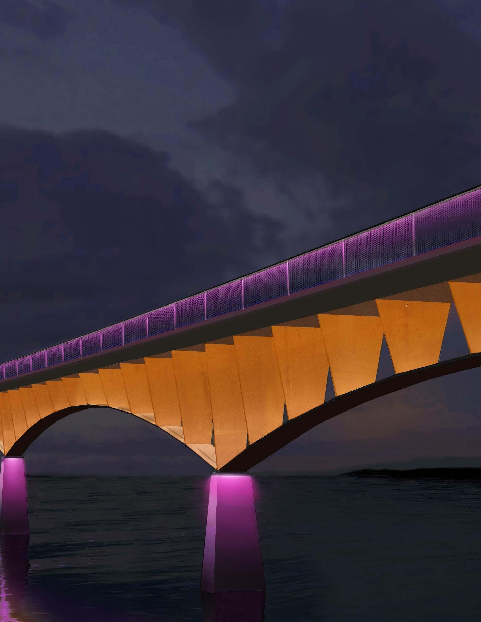 Four lighting layers, warm-white comfort, and restrained color give this bridge a calm civic presence after dark.
