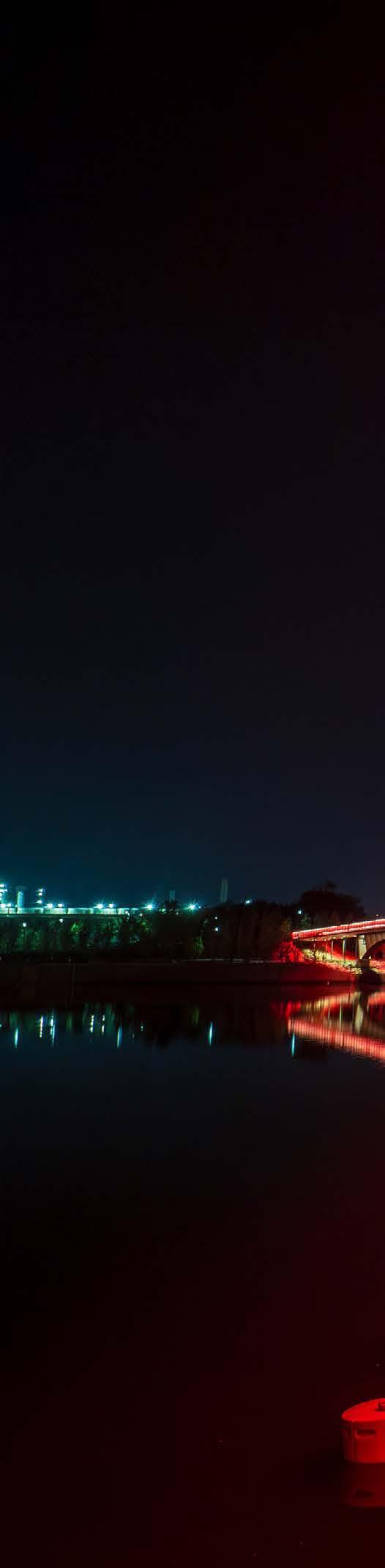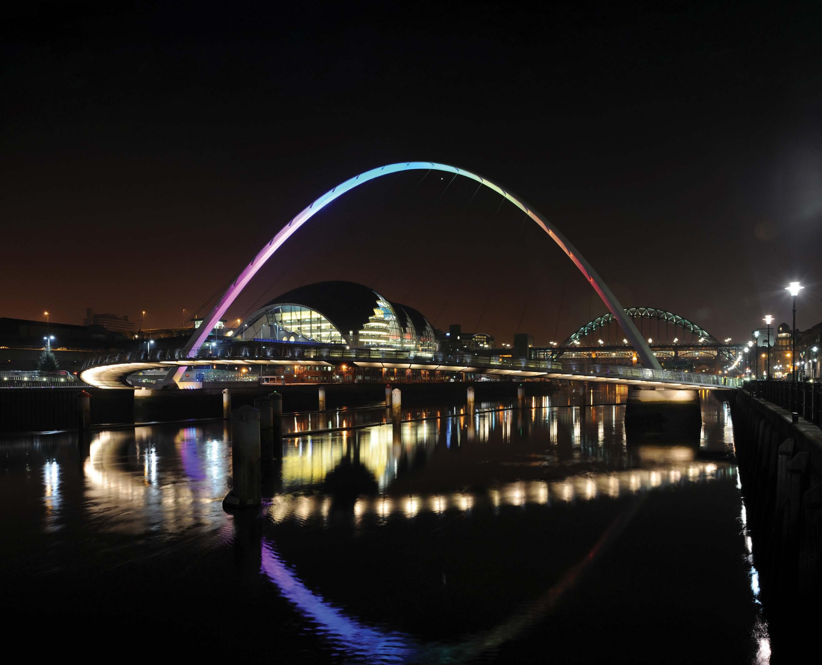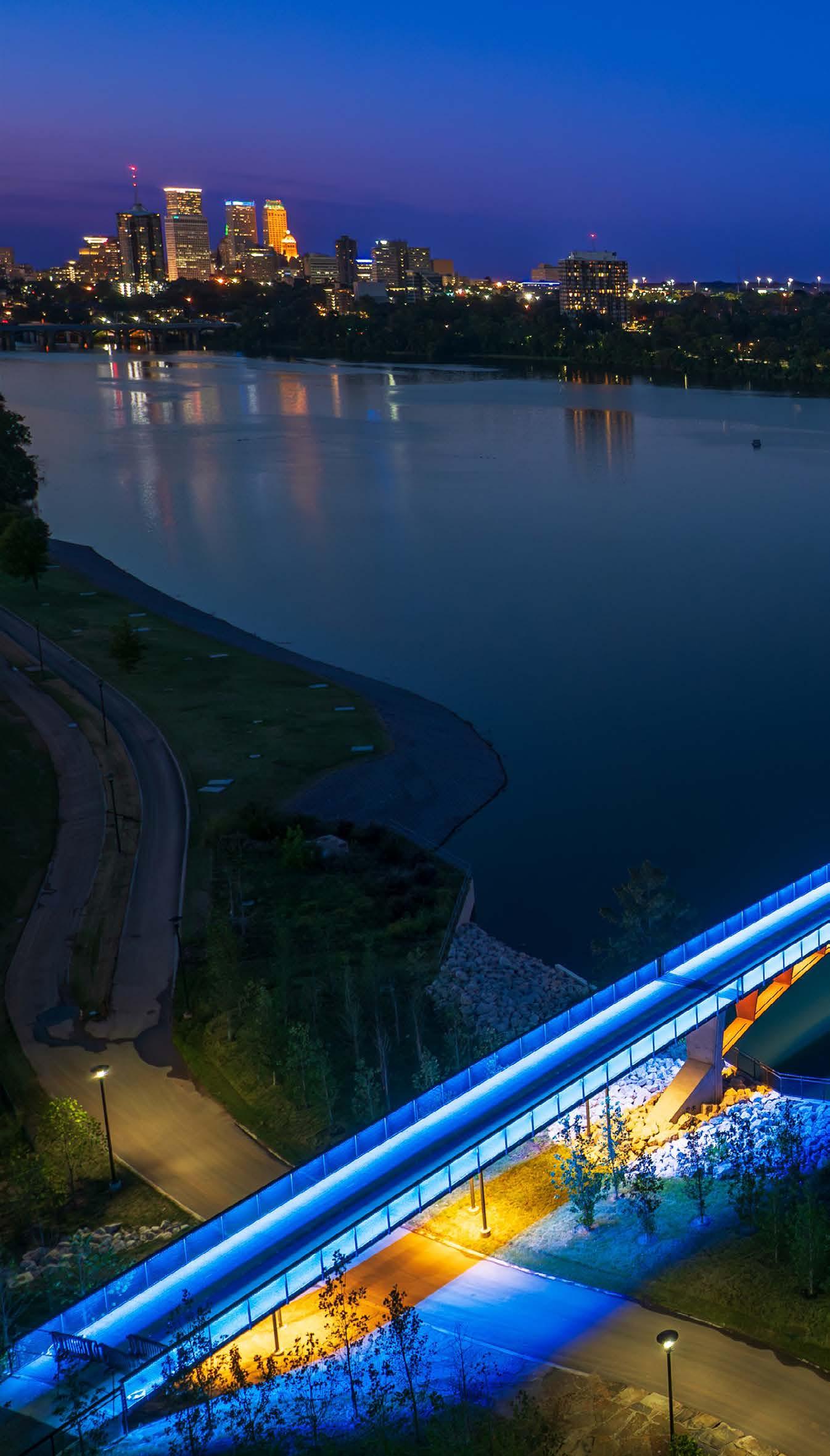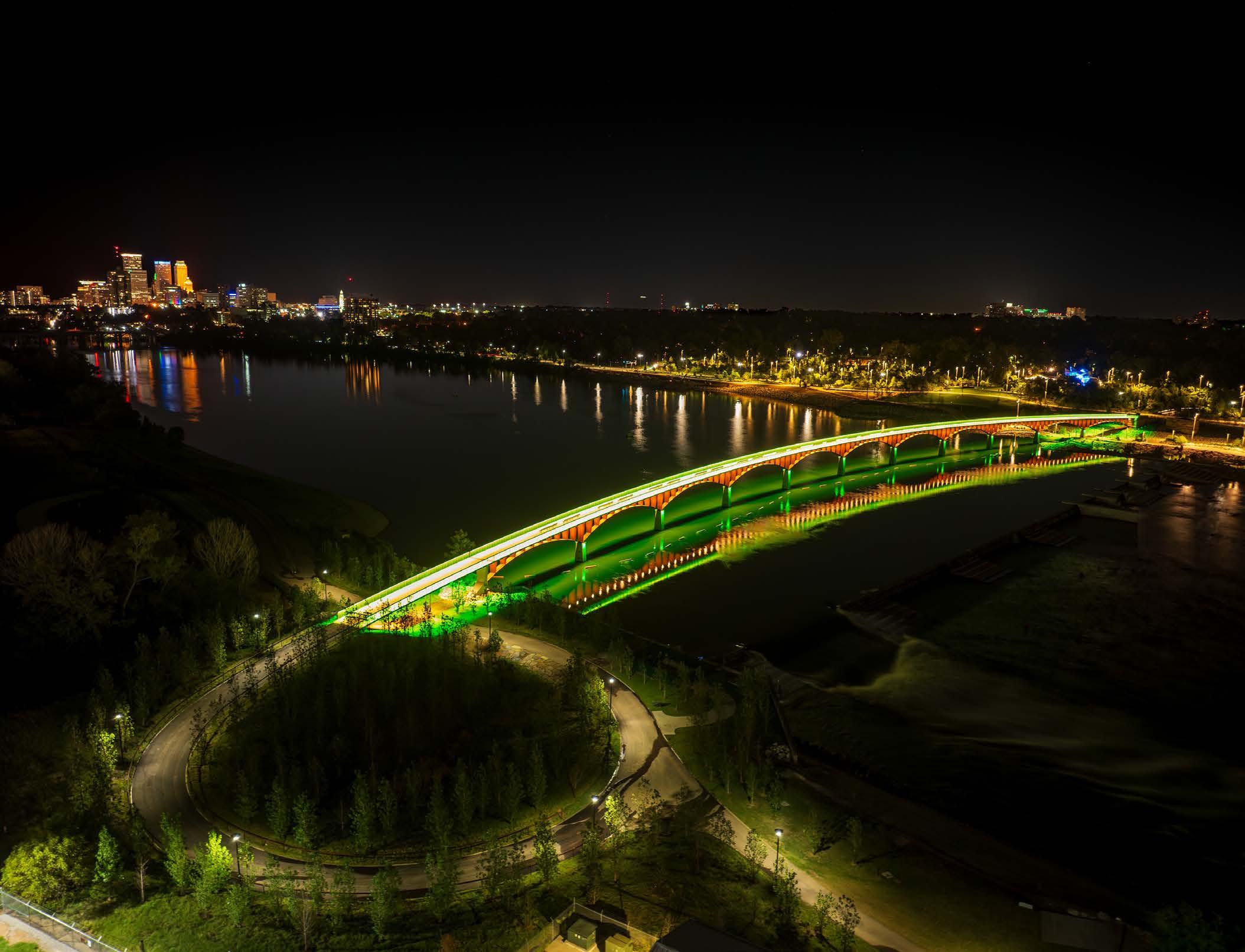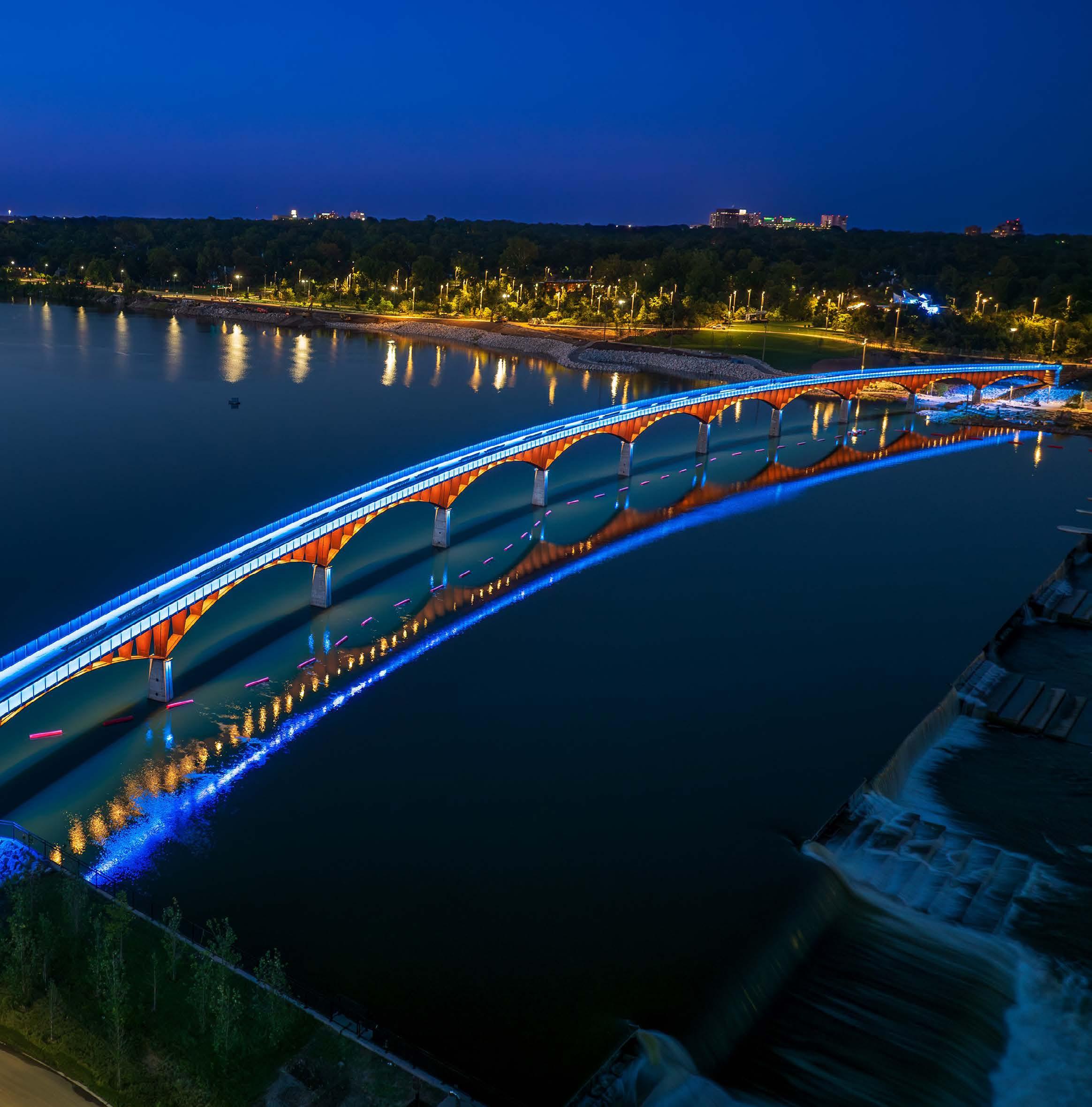 Four lighting layers, warm-white comfort, and restrained color give this bridge a calm civic presence after dark.