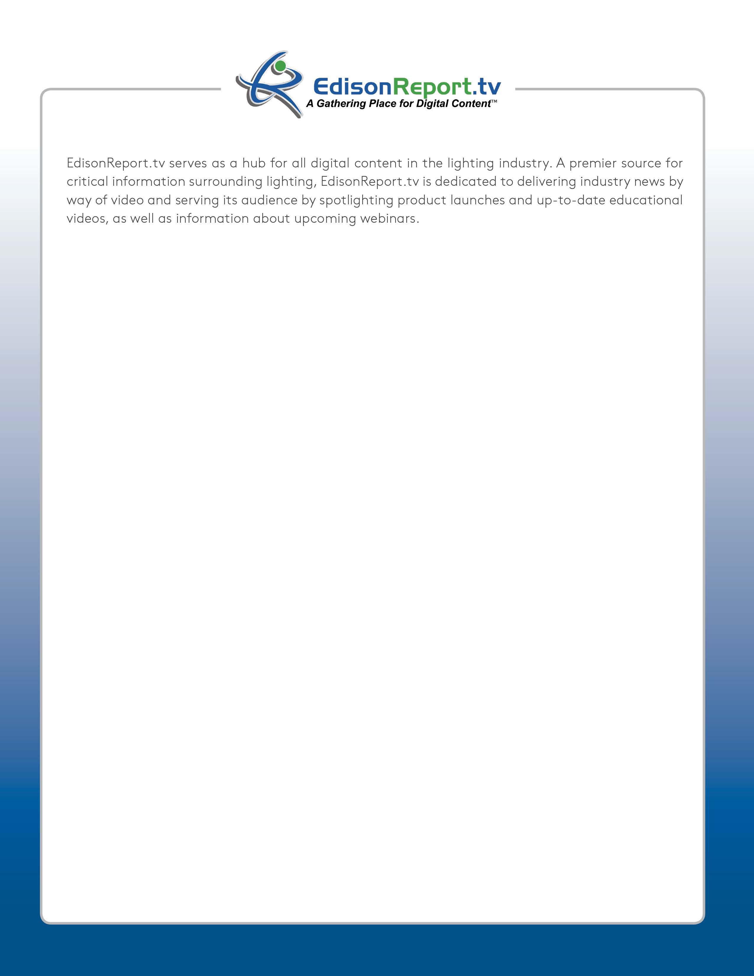 EdisonReport.tv serves as a hub for all digital content in the lighting industry. A premier source for critical information surrounding lighting, EdisonReport.tv is dedicated to delivering industry news by way of video and serving its audience by spotlighting product launches and up-to-date educational videos, as well as information about upcoming webinars.