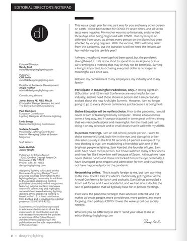 Editorial Director: Randy Reid editor@designinglighting.com Publisher: Cliff Smith csmith@designinglighting.com Director of Audience Development: Angie Hullfish admin@designinglighting.com Contributing Writers: James Benya PE, FIES, FIALD Principal at Design Services, Inc. and The Benya Burnett Consultancy Paul Blackburn European Contributor Lighting Designer at Chroma Lighting Linda Longo Residential Lighting Contributor Stefanie Schwalb Hospitality Lighting Contributor Interim Managing Editor at Boston Magazine Staff Writers: Malia Hullfish Jacob Wright Published by EdisonReport 1726C General George Patton Dr. Brentwood, TN 37027 Phone: 615-371-0961 designinglighting.com designing lighting is focused on the Business of Lighting Design™ and provides business information to the lighting design community. In addition to the website, designing lighting publishes bi-monthly online magazines featuring original content, interviews within the community and highlights successful and award-winning lighting designs. While designing lighting is based in the U.S., it has contributors from Europe and is developing a global presence. (ISSN 2693-9223) Statements and opinions expressed in articles and editorials in dl are the expressions of contributors and do not necessarily represent the policies or opinions of the EdisonReport. Advertisements appearing in the publication are the sole responsibility of the advertiser.