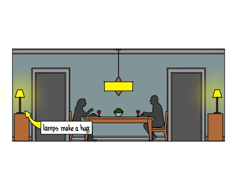 • The ambient layer choice establishes the character and atmosphere of an interior space. The amount of ambient light is important; if significantly lower than the task light, the space will have greater luminance contrasts and appear more dramatic, whereas if similar to the task light levels, the room will be brighter, cheerier and perhaps, more relaxing. The technique could be direct lighting, indirect