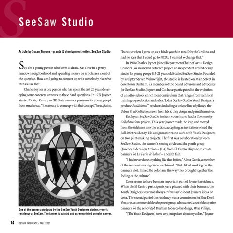 commented, “almost going as far as to say that some of my choices were dated.” Joyner is wearing a black t-shirt and black jeans. The Youth Designers are dressed in a loud and wild array of styles. Leaning back in his chair, Joyner continued, “So we talked about it. I suggested that we do a trend board – collecting colors from what’s out there now: sneakers, fashions, cars. And guess what – they were correct. My colors are kind of dated!” This is the out-spoken energy that Joyner loves. Surveying the banners waiting to be installed Joyner is emphatic, “I want to point out that the results, ALL those ideas came from the Youth Designers. In each one of the final pieces, they can point back to the seed in an idea they introduced.” The Youth Designers were quick to counter that Joyner was not a soft sell. “With Charles, he has a method where he’ll come up with an idea and then he’ll trace it and change it a little bit and trace it and re-change it.” a young woman explained, frowning as she remembers struggling with the frustration of revision. “I wasn’t quite as patient as that so if I did something, he would ask me, ask any of us, to draw it again in a series and make it a little better each time.” “Yes,” another Youth Designer added turning his hands palms up, “even if it was good, he would ask us to refine it.” Joyner accepts this praise with a sly smile. He gives a lot of the credit to Director of SeeSaw Studio Amy Milne (BED 1990) and Studio Program Director Eric Emmanuel Thompson II (BAD 2003), who set up the schedule and organized the work each day. “Eric did an excellent job,” Joyner says. “I would walk in and he would have a schedule for what was going on. There were days when both projects were going on at the same time; times when every aspect of the studio, the computer-generated imagery, the screen-printing, the painting, the sewing, all of that was going on. It was just magical!” The Youth Designers agreed. “It was the most fun,” one designer remarked, his hands waving in every direction, “when everyone was here. The music was blaring and there was a lot of action. You really felt like something was getting done!” Looking back, Joyner admits that they had to push hard to meet their deadlines, but he concludes, “I can’t point to a single bad day!” Milne remembers the day that Cox came into the software lab at NC State where she was working and presented a one sentence description of