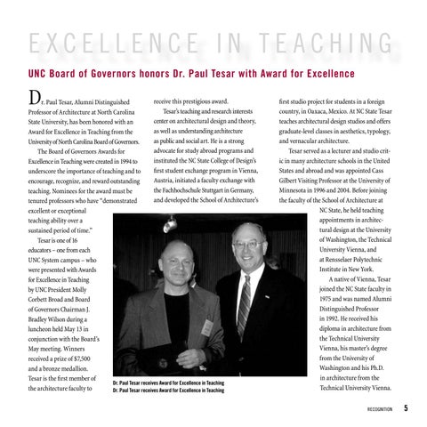 receive this prestigious award. r. Paul Tesar, Alumni Distinguished Tesar’s teaching and research interests Professor of Architecture at North Carolina center on architectural design and theory, State University, has been honored with an as well as understanding architecture Award for Excellence in Teaching from the as public and social art. He is a strong University of North Carolina Board of Governors. advocate for study abroad programs and The Board of Governors Awards for instituted the NC State College of Design’s Excellence in Teaching were created in 1994 to first student exchange program in Vienna, underscore the importance of teaching and to Austria, initiated a faculty exchange with encourage, recognize, and reward outstanding the Fachhochschule Stuttgart in Germany, teaching. Nominees for the award must be and developed the School of Architecture’s tenured professors who have “demonstrated excellent or exceptional teaching ability over a sustained period of time.” Tesar is one of 16 educators – one from each UNC System campus – who were presented with Awards for Excellence in Teaching by UNC President Molly Corbett Broad and Board of Governors Chairman J. Bradley Wilson during a luncheon held May 13 in conjunction with the Board’s May meeting. Winners received a prize of $7,500 and a bronze medallion. Tesar is the first member of Dr. Paul Tesar receives Award for Excellence in Teaching the architecture faculty to Dr. Paul Tesar receives Award for Excellence in Teaching