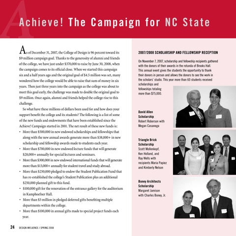 s of December 31, 2007, the College of Design is 96 percent toward its $9 million campaign goal. Thanks to the generosity of alumni and friends of the college, we have just under $370,000 to raise by June 30, 2008, when the campaign comes to its official close. When we started this campaign six and a half years ago and the original goal of $4.5 million was set, many wondered how the college would be able to raise that sum of money in six years. Then just three years into the campaign as the college was about to meet this goal early, the challenge was made to double the original goal to $9 million. Once again, alumni and friends helped the college rise to this challenge. So what have these millions of dollars been used for and how does your support benefit the college and its students? The following is a list of some of the new funds and endowments that have been established since the Achieve! Campaign started in 2001. The net result of these new funds is: • More than $500,000 in new endowed scholarships and fellowships that along with the new annual awards generate more than $38,000+ in new scholarship and fellowship awards made to students each year. • More than $700,000 in new endowed lecture funds that will generate $28,000+ annually for special lectures and seminars. • More than $300,000 in new endowed international funds that will generate more than $13,000+ annually for student travel and study abroad. • More than $250,000 pledged to endow the Student Publication Fund that has re-established the college’s Student Publication plus an additional $250,000 planned gift to this fund. • $100,000 gift for the renovation of the entrance gallery for the auditorium in Kamphoefner Hall. • More than $3 million in pledged deferred gifts benefiting multiple departments within the college. • More than $100,000 in annual gifts made to special project funds each year.