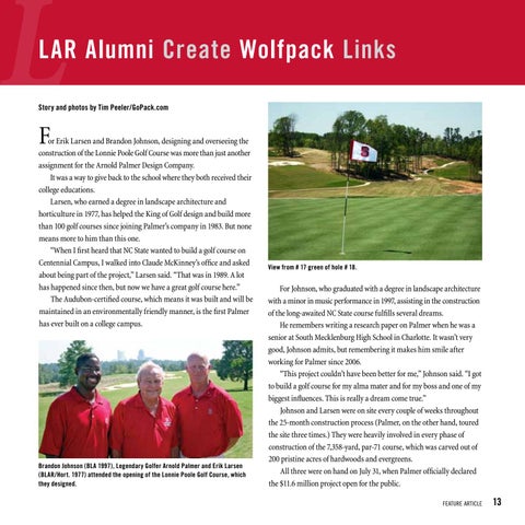 or Erik Larsen and Brandon Johnson, designing and overseeing the construction of the Lonnie Poole Golf Course was more than just another assignment for the Arnold Palmer Design Company. It was a way to give back to the school where they both received their college educations. Larsen, who earned a degree in landscape architecture and horticulture in 1977, has helped the King of Golf design and build more than 100 golf courses since joining Palmer’s company in 1983. But none means more to him than this one. “When I first heard that NC State wanted to build a golf course on Centennial Campus, I walked into Claude McKinney’s office and asked about being part of the project,” Larsen said. “That was in 1989. A lot has happened since then, but now we have a great golf course here.” The Audubon-certified course, which means it was built and will be maintained in an environmentally friendly manner, is the first Palmer has ever built on a college campus.