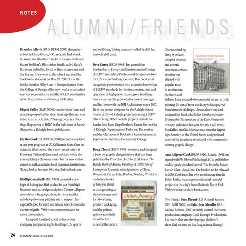 and outfitting/fishing company called Frabill Inc. (www.frabill.com). Dave Carey (BEDA 1998) has earned the Leadership in Energy and Environmental Design (LEED®) Accredited Professional designation from the U.S. Green Building Council. This credential recognizes professionals with extensive knowledge of LEED® standards for design, construction, and operation of high performance green buildings. Carey was recently promoted to project manager and has been with the HH Architecture since 2007. He is the project designer for the Raleigh Senior Center, a City of Raleigh project pursuing LEED® Silver rating. Other notable projects include the Sanderford Road Neighborhood Center for the City of Raleigh Department of Parks and Recreation and the Classroom & Bookstore Redevelopment at Fayetteville Technical Community College. Doug Clouse (BEDV 1988) co-wrote and designed a book on graphic design history that has been published by Princeton Architectural Press. The Handy Book of Artistic Printing: A Collection of Letterpress Examples with Specimens of Type, Ornament, Corner Fills, Borders, Twisters, Wrinklers, and other Freaks of Fancy is about artistic printing, a style of design used for advertising, product packaging, and the printed ephemera of daily life of the late nineteenth century.