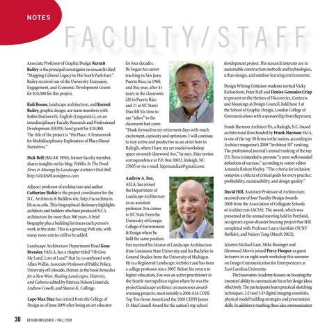 for four decades. He began his career teaching in San Juan, Puerto Rico, in 1968, and this year, after 41 years in the classroom (20 in Puerto Rico and 21 at NC State) Díaz felt his time to say “adios” to the classroom had come. “I look forward to my retirement days with much excitement, curiosity and optimism. I will continue to stay active and productive as an artist here in Raleigh, where I have my art studio/workshop space on south Glenwood Ave,” he says. Díaz invites correspondence at P.O. Box 10012, Raleigh, NC 27605 or via e-mail: lopemaxdiaz@gmail.com. Andrew A. Fox, ASLA, has joined the Department of Landscape Architecture as an assistant professor. Fox comes to NC State from the University of Georgia College of Environment & Design where he held the same position. Fox received his Master of Landscape Architecture from Louisiana State University and his Bachelor in General Studies from the University of Michigan. He is a Registered Landscape Architect and has been a college professor since 2007. Before his return to higher education, Fox was an active practitioner in the Seattle metropolitan region where he was the project landscape architect on numerous awardwinning projects, most notably a 2006 AIA COTE Top Ten Green Award and the 2005 CEFPI James D. MacConnell Award for the nation's top school