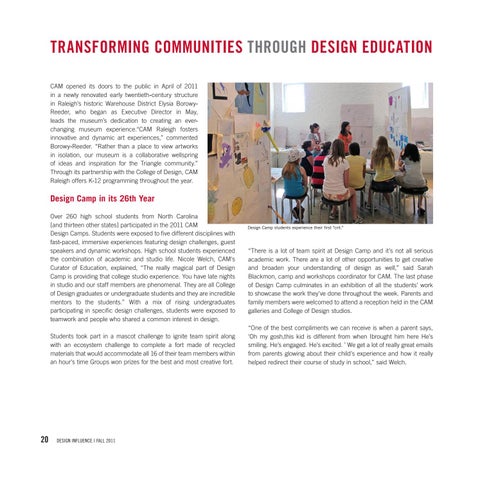 Design Camp in its 26th Year Over 260 high school students from North Carolina [and thirteen other states] participated in the 2011 CAM Design Camps. Students were exposed to five different disciplines with fast-paced, immersive experiences featuring design challenges, guest speakers and dynamic workshops. High school students experienced the combination of academic and studio life. Nicole Welch, CAM's Curator of Education, explained, “The really magical part of Design Camp is providing that college studio experience. You have late nights in studio and our staff members are phenomenal. They are all College of Design graduates or undergraduate students and they are incredible mentors to the students.” With a mix of rising undergraduates participating in specific design challenges, students were exposed to teamwork and people who shared a common interest in design. Students took part in a mascot challenge to ignite team spirit along with an ecosystem challenge to complete a fort made of recycled materials that would accommodate all 16 of their team members within an hour's time Groups won prizes for the best and most creative fort.
