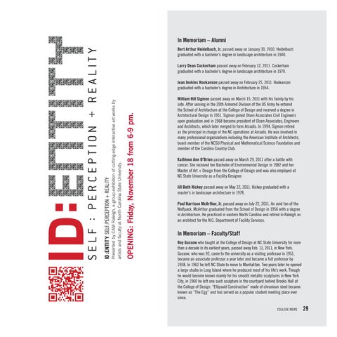 In Memoriam – Faculty/Staff Roy Gussow who taught at the College of Design at NC State University for more than a decade in its earliest years, passed away Feb. 11, 2011, in New York. Gussow, who was 92, came to the university as a visiting professor in 1951, became an associate professor a year later and became a full professor by 1958. In 1962 he left NC State to move to Manhattan. Two years later he opened a large studio in Long Island where he produced most of his life’s work. Though he would become known mainly for his smooth metallic sculptures in New York City, in 1960 he left one such sculpture in the courtyard behind Brooks Hall at the College of Design. “Ellipsoid Construction” made of chromium steel became known as “The Egg” and has served as a popular student meeting place ever since. COLLEGE NEWS