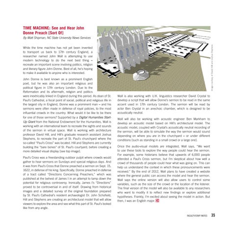 Wall is also working with U.K. linguistics researcher David Crystal to develop a script that will allow Donne’s sermon to be read in the same accent used in 17th century London. The sermon will be read by actor Ben Crystal in an anechoic chamber, which is designed to be acoustically neutral. Wall will also be working with acoustic engineer Ben Markham to develop an acoustic model based on Hill’s architectural model. The acoustic model, coupled with Crystal’s acoustically neutral recording of the sermon, will be able to simulate the way the sermon would sound depending on where you are in the churchyard – or under different conditions [such as standing in a small crowd or a large one]. Once the audio-visual models are integrated, Wall says, “We want to use these tools to explore the way people could hear the sermon. For example, some historians believe that upwards of 6,000 people attended a Paul’s Cross sermon, but I’m skeptical about how well a crowd of thousands of people could hear what was going on. This can help us understand the context in which these pronouncements were received.” By the end of 2012, Wall plans to have created a website where the general public can access the model and hear the sermon. Wall says the online version will also allow users to control some variables, such as the size of the crowd or the location of the listener. The final version of the model will also be available to any researchers who want to modify it to reflect new findings or explore additional hypotheses. Frankly, I’m excited about seeing the model in action. But then, I was an English major.
