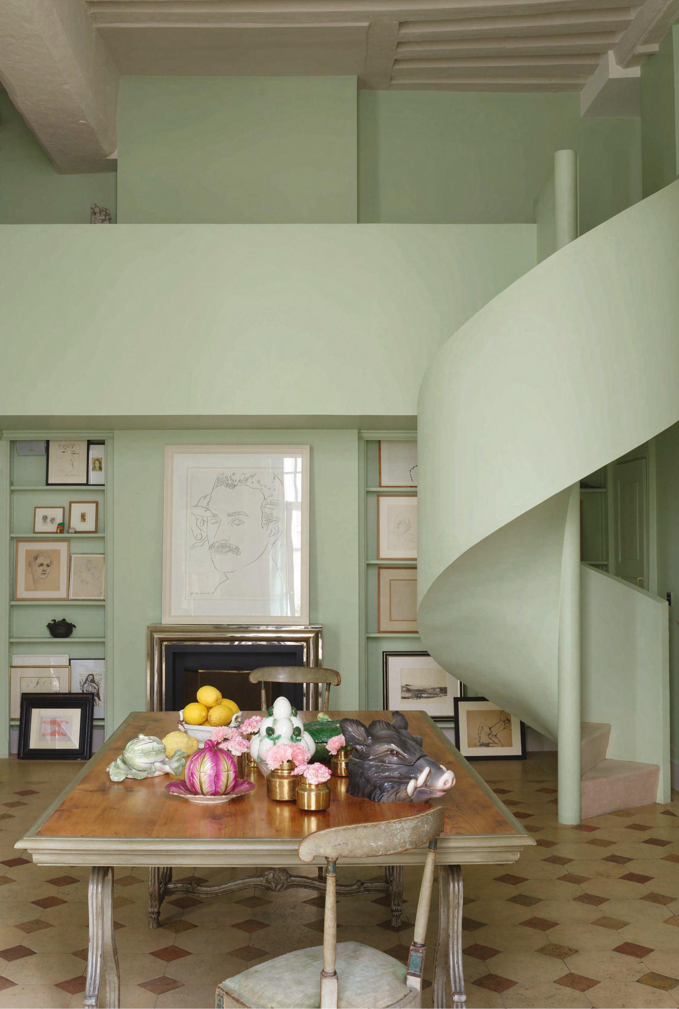 THE DINING ROOM OF GIAMBATTISTA VALLI’S PARIS HOME, FEATURING A SPIRAL STAIRCASE BY “STUCCODORE” PIERRE CHAPELAIN, AS PHOTOGRAPHED BY SIMON UPTON FOR THE WORLD OF INTERIORS.