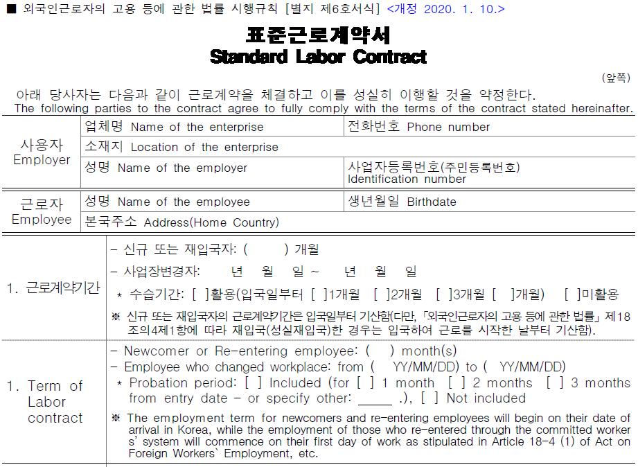 ①~⑧은 고용허가서와 동일하게 적어 주시기 바랍니다 가사사용인은 사업장명과 대표자란에 사용인의 이 름을, 사업자등록번호란에는 주민등록번호를 적어 주시기 바랍니다