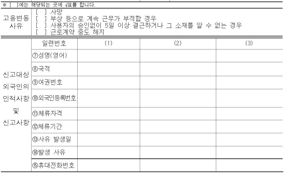 ※ 신고대상 외국인근로자가 4명 이상인 경우 해당외국인근로자의 인적사항 및 신고 사유를 별지의 근로 자명부로 만들어 첨부할 수 있습니다 ※ 외국인근로자 고용변동 등 신고 사유가 발생한 경우에는 고용변동 등 신고 외에 「출입국관리법」 제 19조제1항 및 같은 법 시행령 제24조에 따라 관할 출입국관리사무소장 또는 출장소장에게 ‘고용외국인 변동사유발생신고서’를 제출해야 합니다