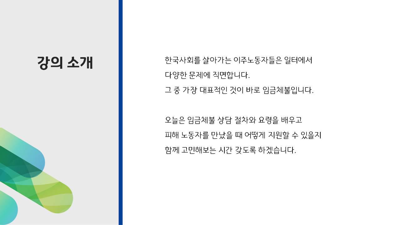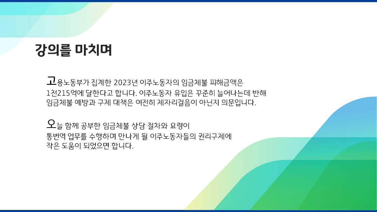 ・ 7강 근로계약과 임금계산 ・ 8강 고용허가제 노동자 이해와 상담 ・ 9강 결혼이민자와 체류자격