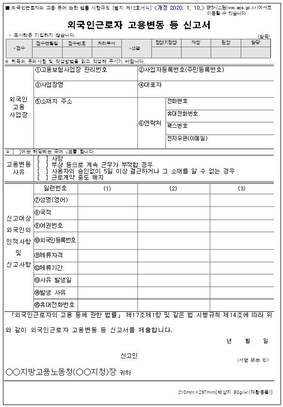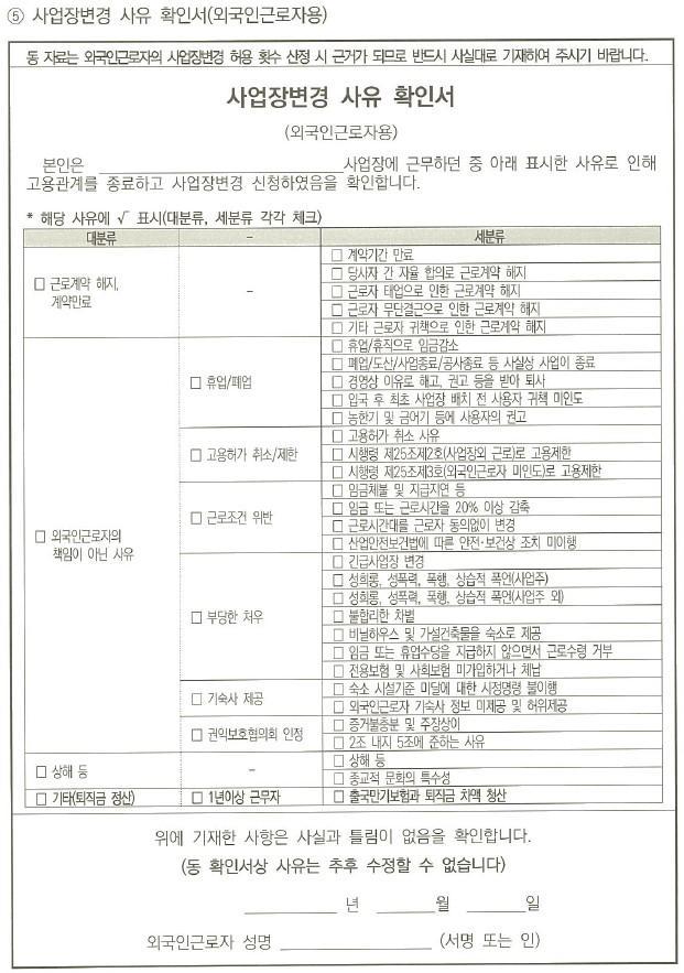 사업장 변경신청 사유 [ ]근로계약기간 만료 [ ]근로계약 해지 [ ]휴업 폐업 고용허가의 취소 또는 고용의 제한 등 고용노동부장관이 고시한 사유 [ ]상해 등 「외국인근로자의 고용 등에 관한 법률」 제25조제1항 및 같은 법 시행규칙 제16조제1항에 따라 위에 적은 사항은 사실과 다름이 없음을 확인합니다 년 월 일 신청인 (서명 또 는 인) ○○지방고 용노동청( ○○지청) 장 귀하 신청인 제출서류 여권 사본(「출입국관리법」 제88조에 따른 외국인등록 사실증명을 확인할 수 없는 경우에 만 제출합니다) 수수료 없음 담당 공무원 확인사항 「출입국관리법」 제88조에 따른 외국인등록 사실증명 행정정보 공동이용 동의서 본인은 이 건 업무처리와 관련하여 담당 공무원이 「전자정부법」제36조제1항에 따른 행정정보의 공동이용을 통하여 위의 담당 공무원 확인 사항을 확인하는 것에 동의합니다 *동의하지 아니하는 경우에는 신청인이 직접 관련 서류를 제출하여야 합니다 신청인 (서명 또는 인 ) 작성방법