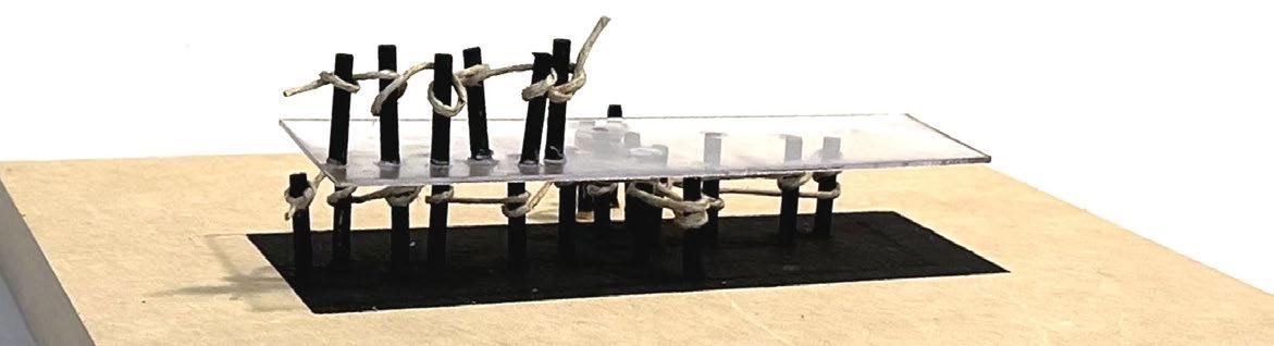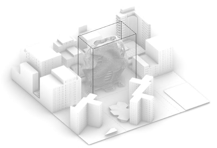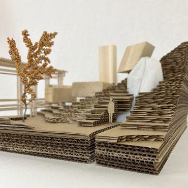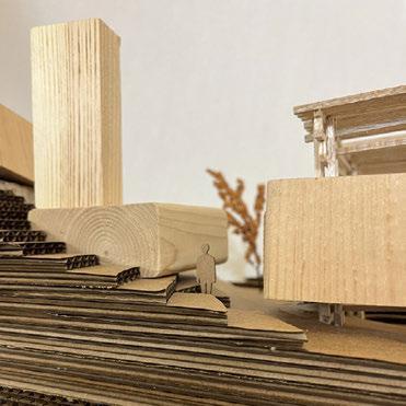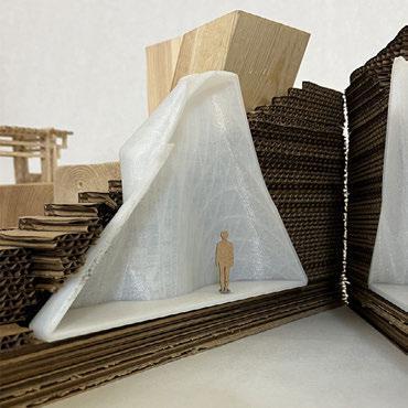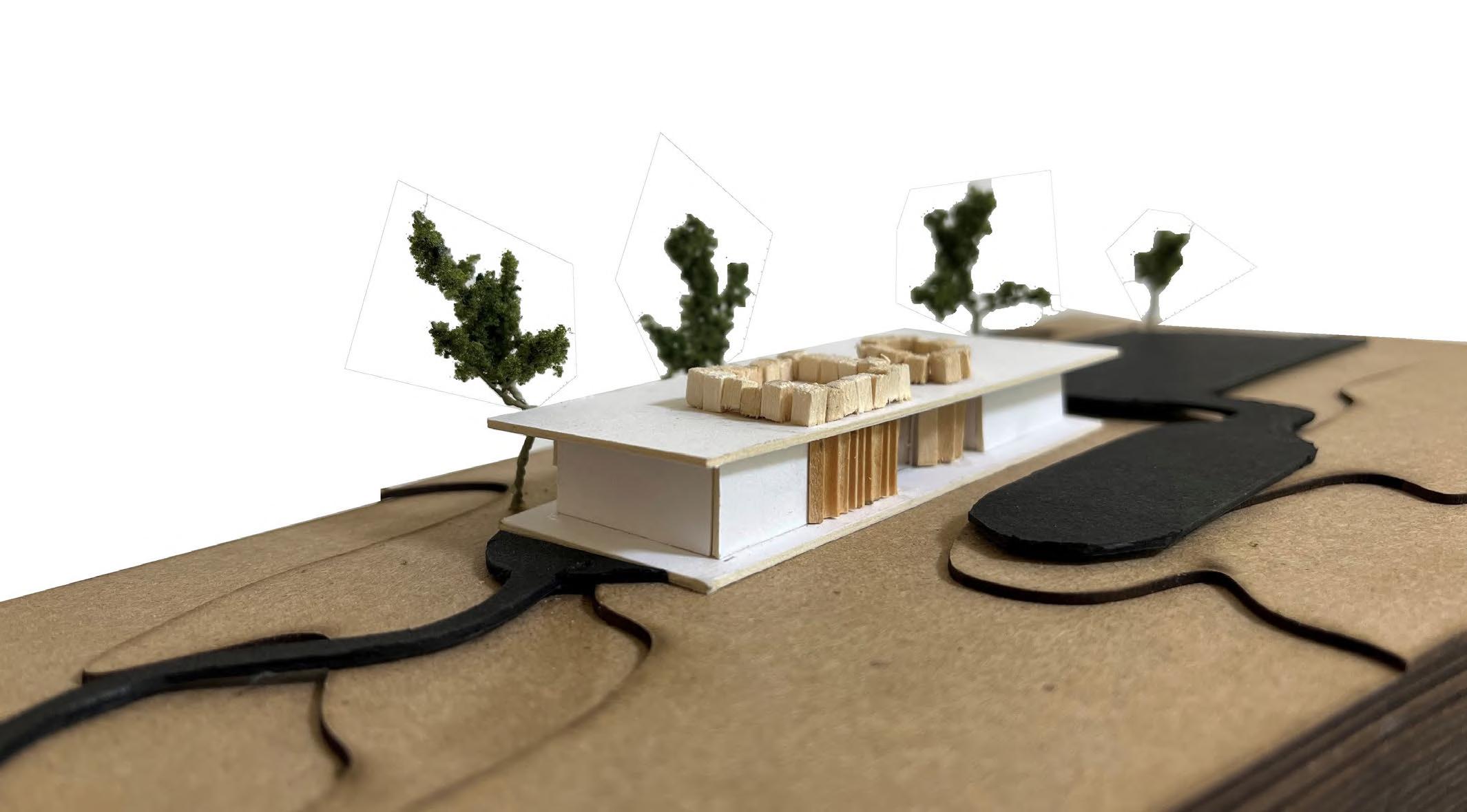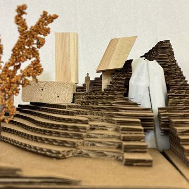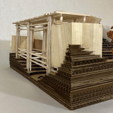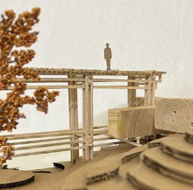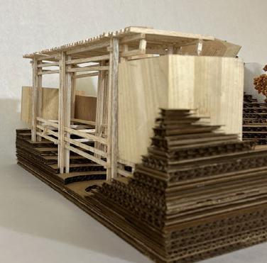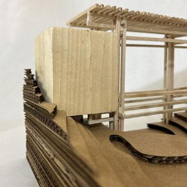For Glueless & Clueless, we were tasked to make a city composed of different elements including wood blocks, stick structure, a 3-D printed element, and all on laser cut topography. This project’s main purpose was to get us accustomed to using different model making elements, as well as think about different ways to incorporate structure into topography. First we created our topography by taking lines from a photo of a tree trunk and tracing the rings and extruding them to create a very unrealistic challenging topo. We also wanted to find ways to form paths along the topo where it was steeper to help connect the different structures, as well as cut small gathering spaces into the topo where people could congregate. For our wood blocks, we kept the block shape very simple and cut into the topo areas where they could sit within the earth. For our stick structure we created bridge that also holds two of the wood blocks using a wedging method that helps increase the strength of the bridge and in theory could be made without using glue. Finally, for our 3-D printed piece my partner and I went through a long process of trial and error to successfully print our organic shaped structure that is placed within the topo, all except a small portion that peaks through the top intended to bring light down into the space. All the different elements serve different purposes, but are still connected to easily guide occupiers throughout the ‘city.’