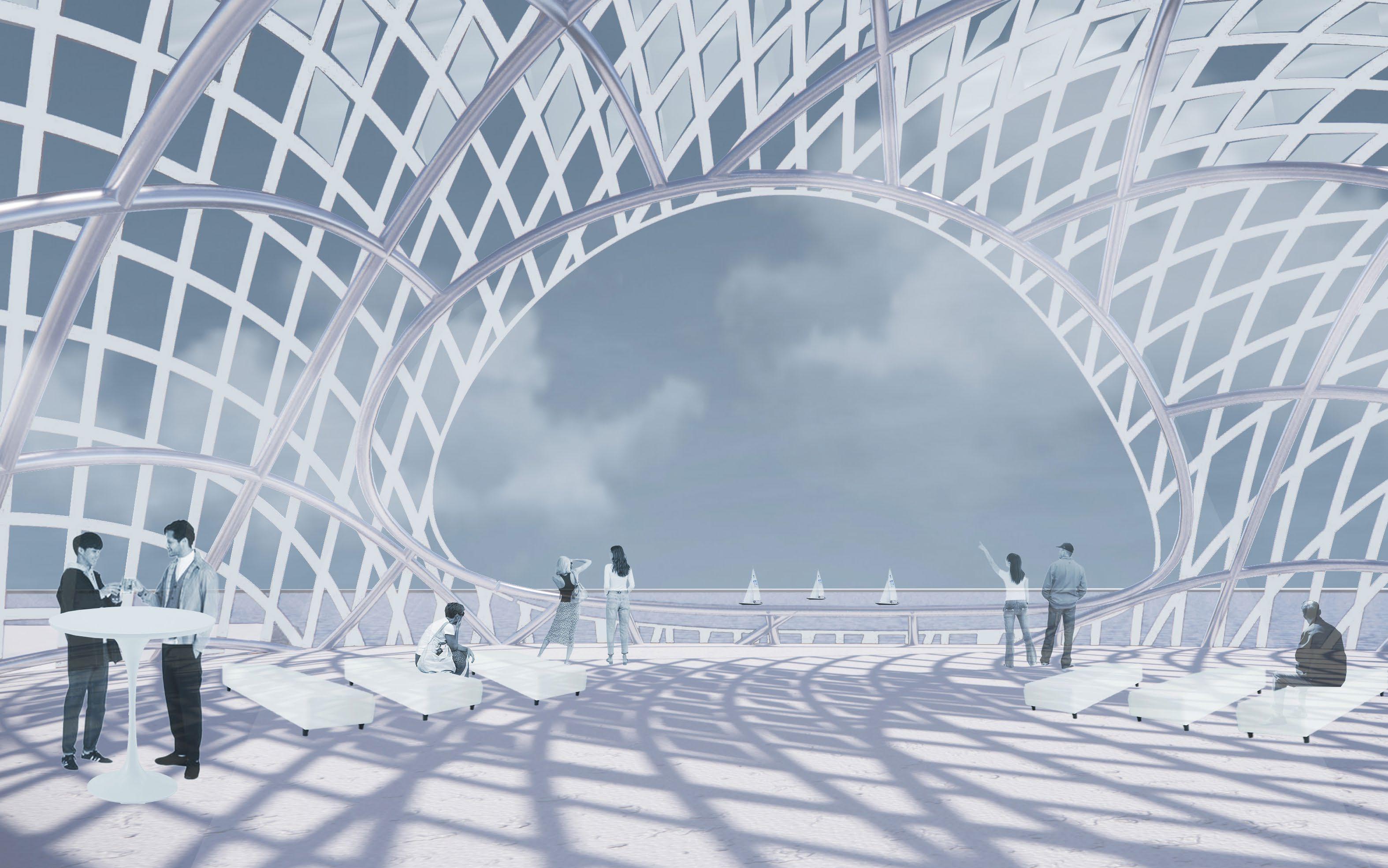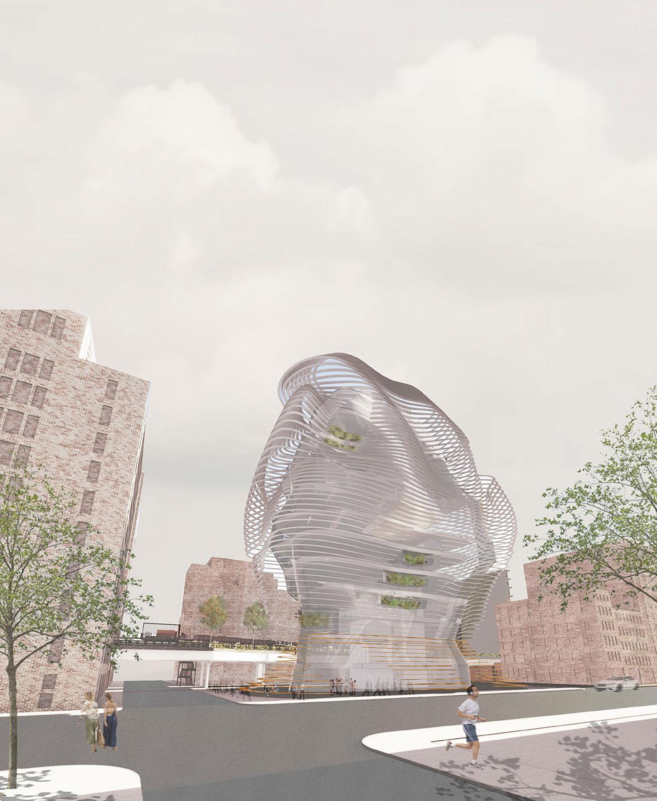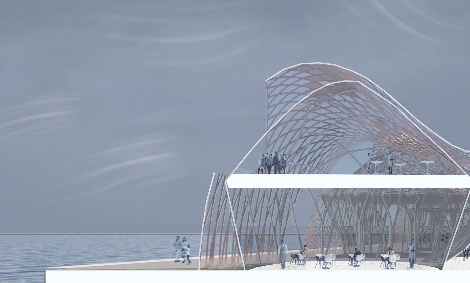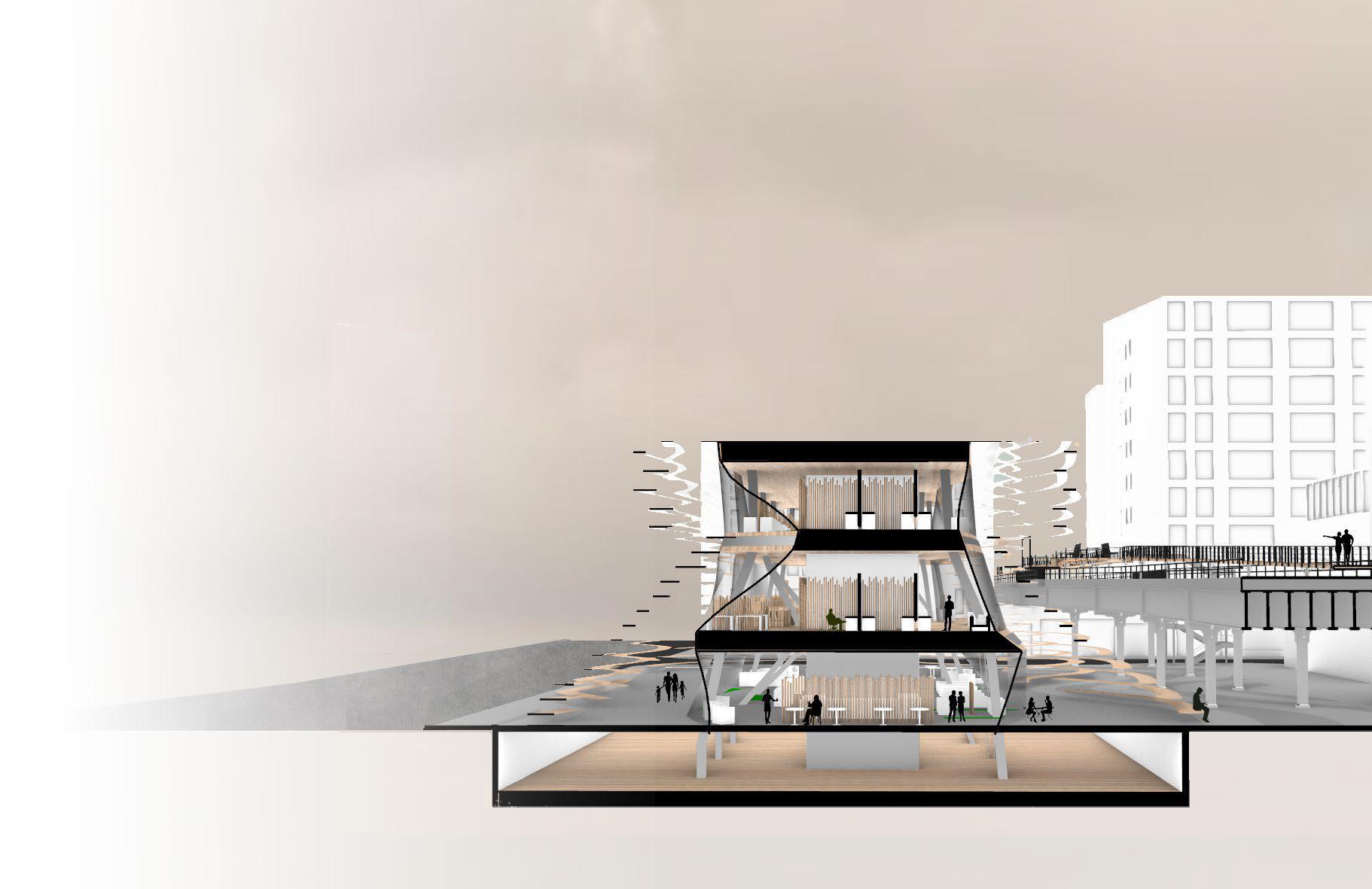Influenced by the strong winds along the coast of Barcelona, Spain this project takes inspiration from how wind forms nature and how to channel wind as an energy source. The form is based on how wind shapes sand dunes, seen in both the interior structures that house the program and the exterior facade. Taking the concept of wind even further, small diamond shaped wind turbines are embedded along the facade that catch the breeze and spin to generate energy sustaining the whole site.
