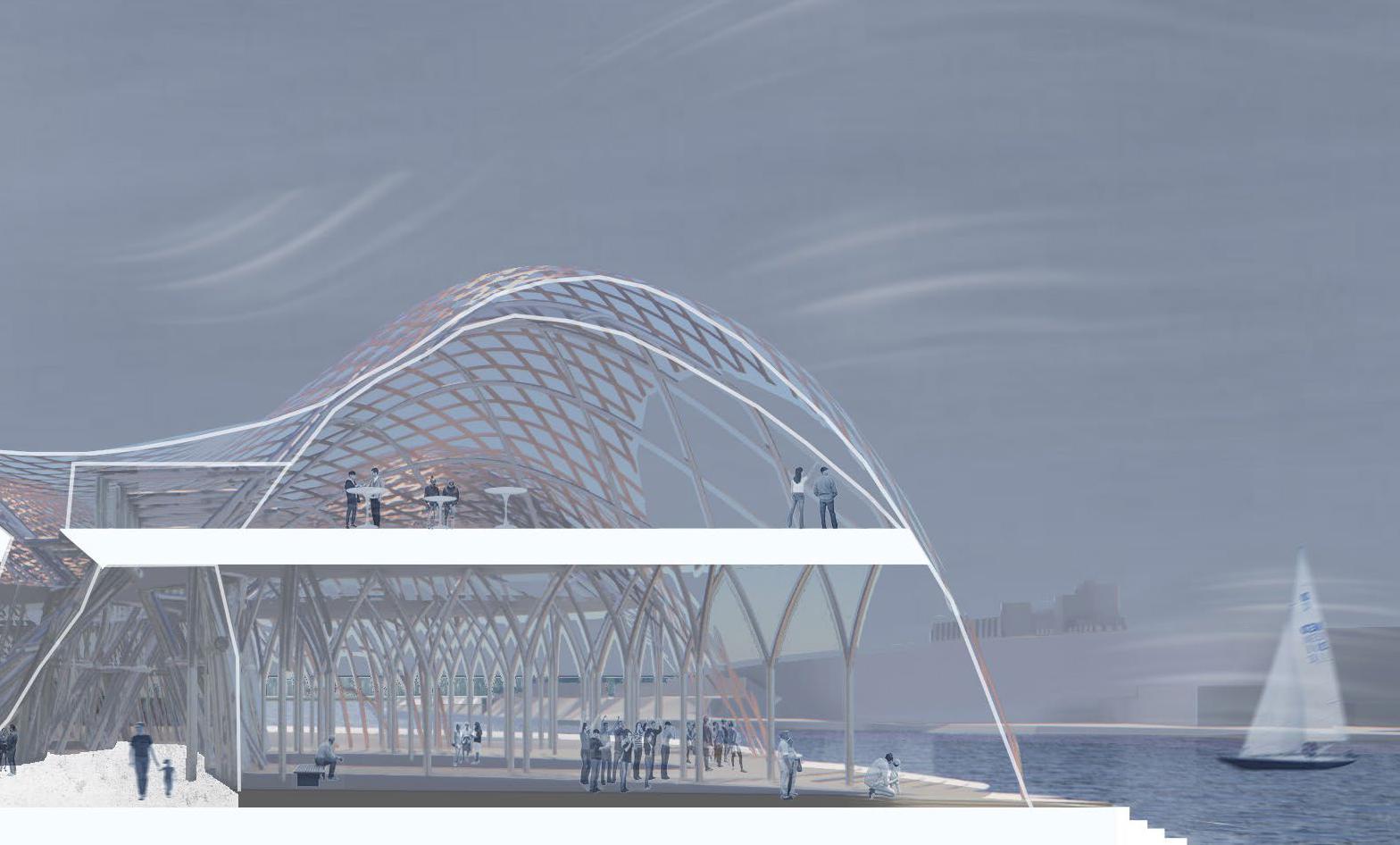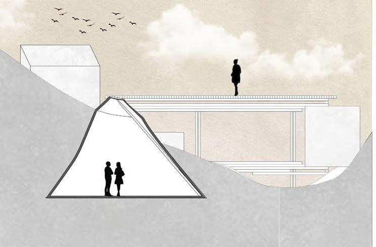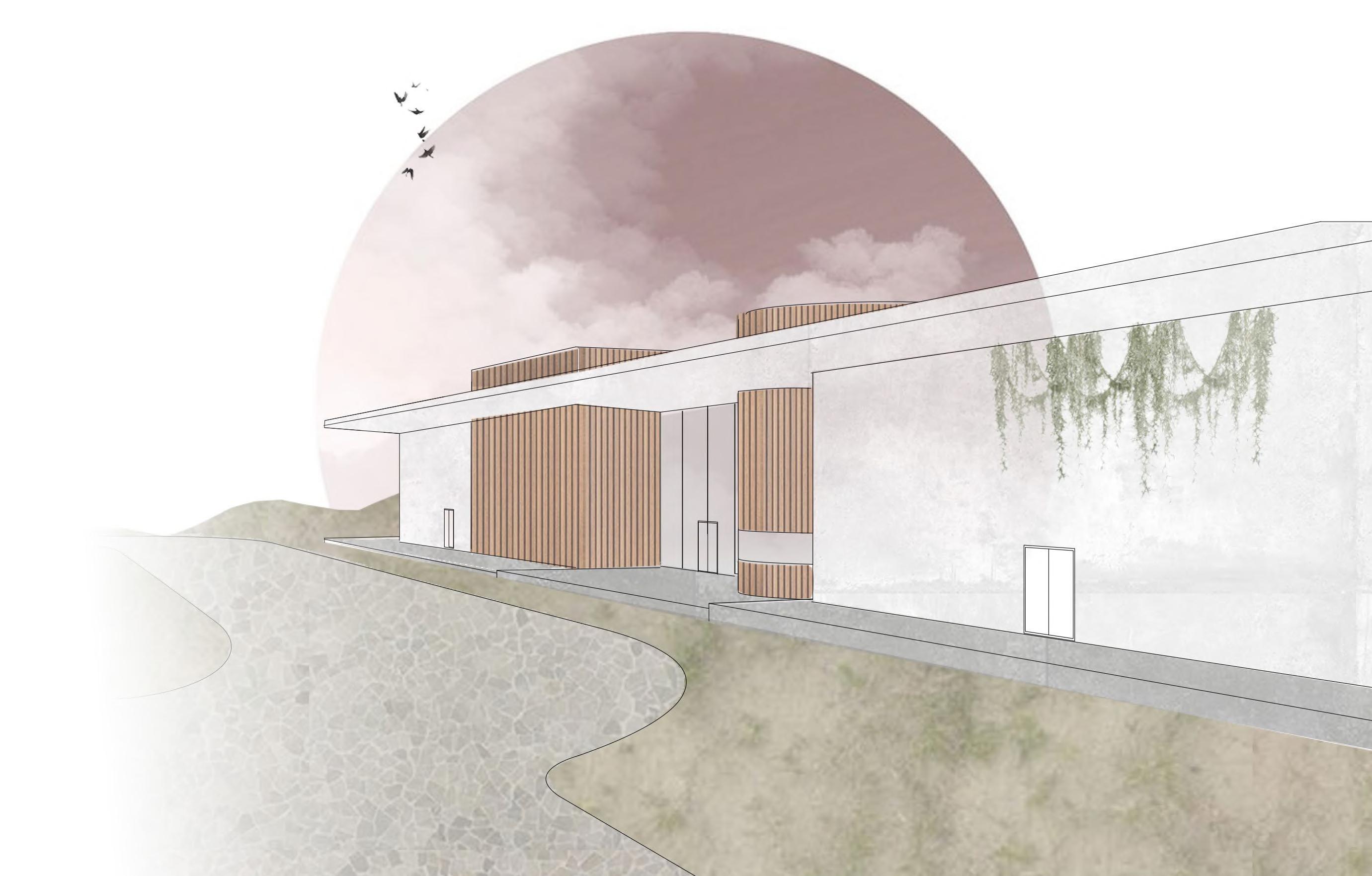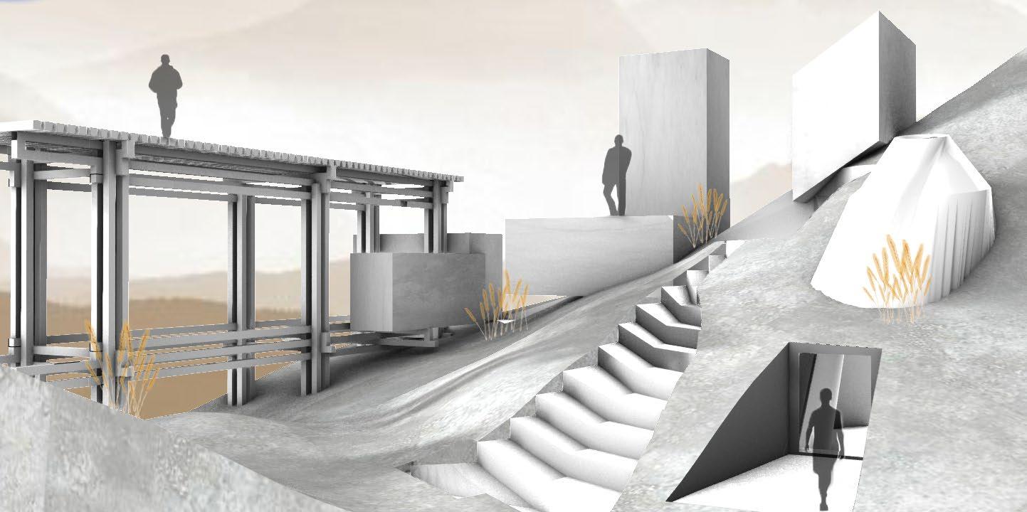 Influenced by the strong winds along the coast of Barcelona, Spain this project takes inspiration from how wind forms nature and how to channel wind as an energy source. The form is based on how wind shapes sand dunes, seen in both the interior structures that house the program and the exterior facade. Taking the concept of wind even further, small diamond shaped wind turbines are embedded along the facade that catch the breeze and spin to generate energy sustaining the whole site.