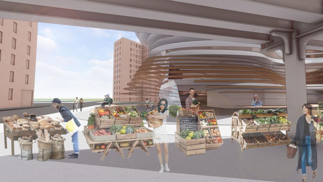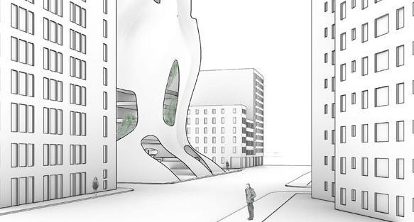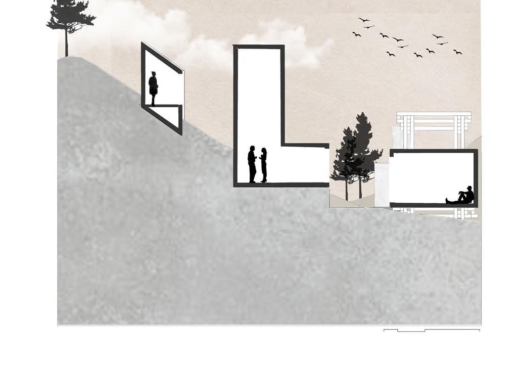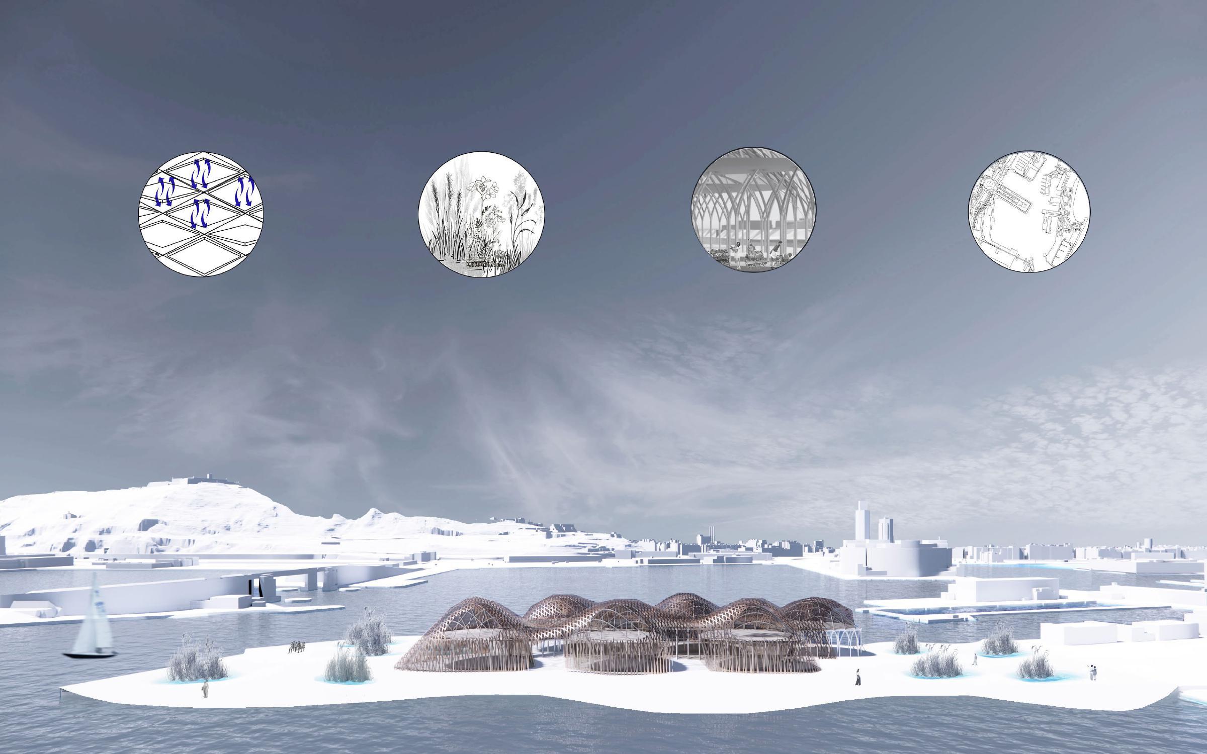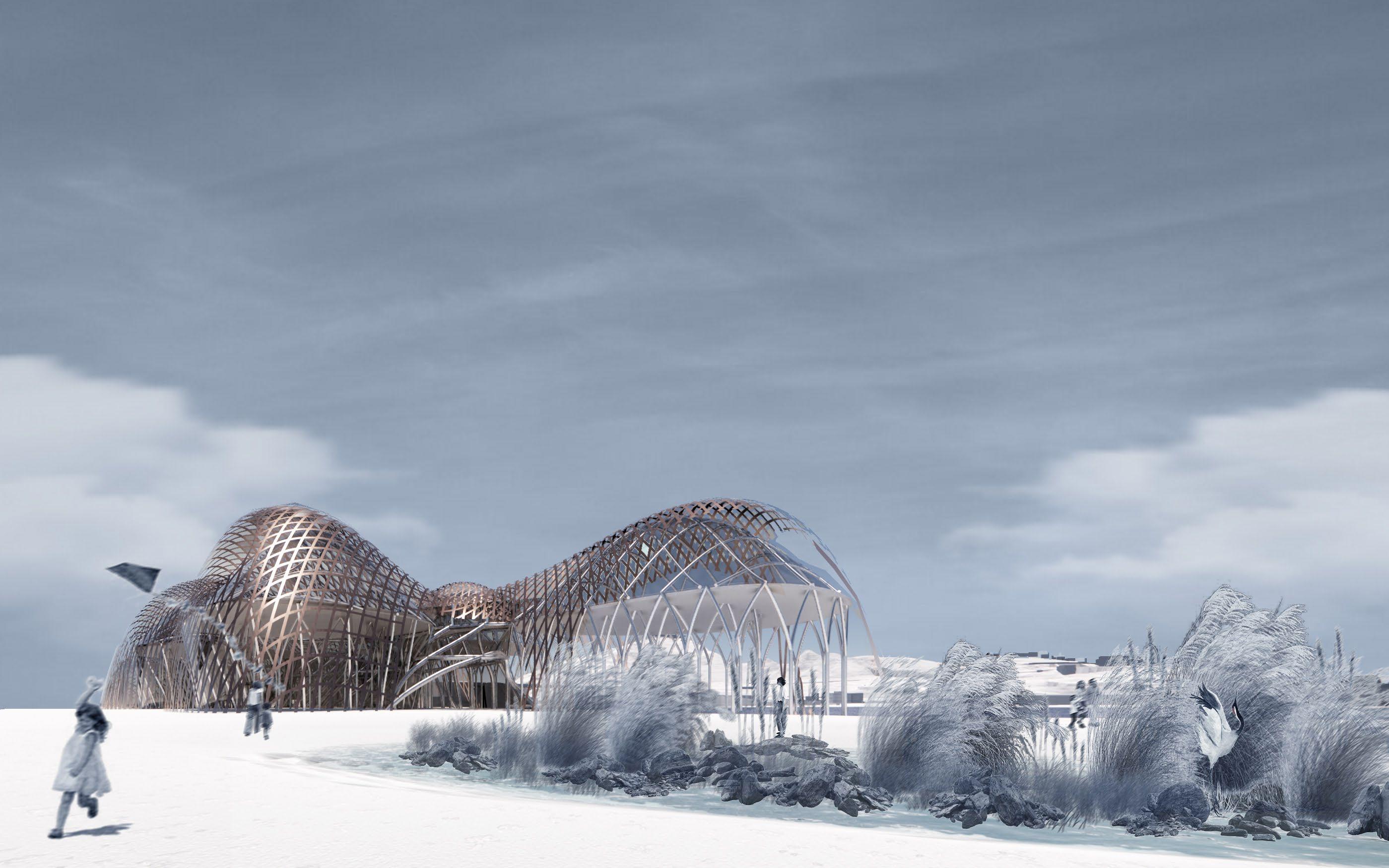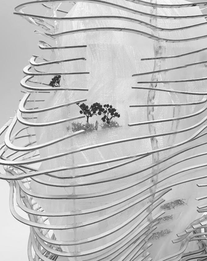 Influenced by the strong winds along the coast of Barcelona, Spain this project takes inspiration from how wind forms nature and how to channel wind as an energy source. The form is based on how wind shapes sand dunes, seen in both the interior structures that house the program and the exterior facade. Taking the concept of wind even further, small diamond shaped wind turbines are embedded along the facade that catch the breeze and spin to generate energy sustaining the whole site.
