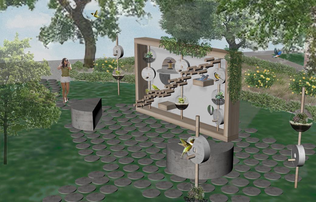 My project Co-habitating is about the interaction of life and of spaces. The give and take relationship between birds and plants, but also the meshing of natural landscape and man-made structures. It is an escape from the business of life, a literal walk in the park. It is adaptable for a variety of uses, including spinnable bird houses and terrariums, pull out bird baths or planters, and openable windows and doors to allow light through, hang bird feeders or weave. greenery through.