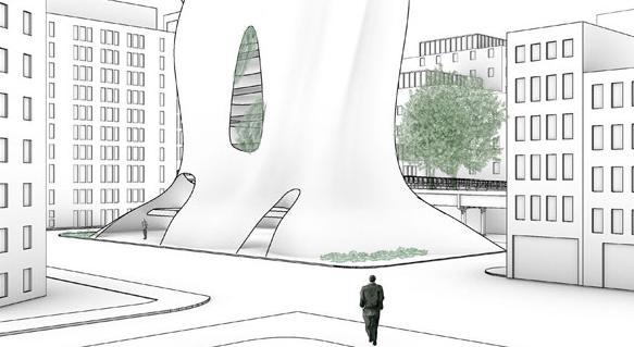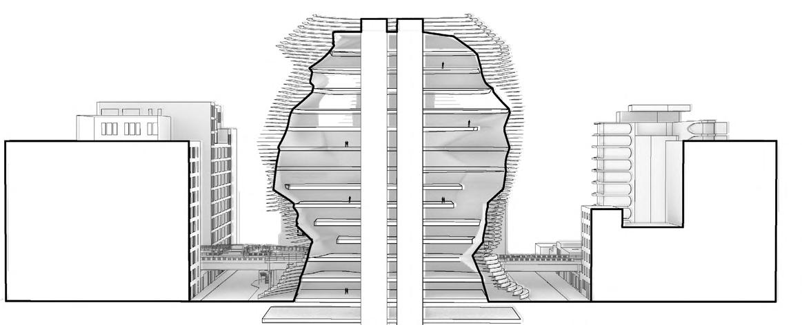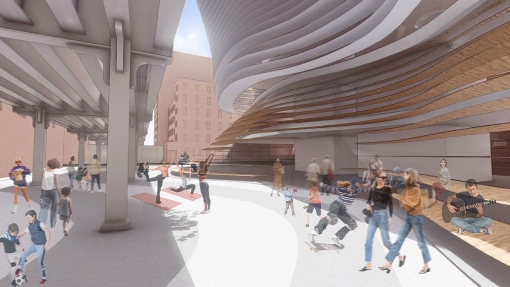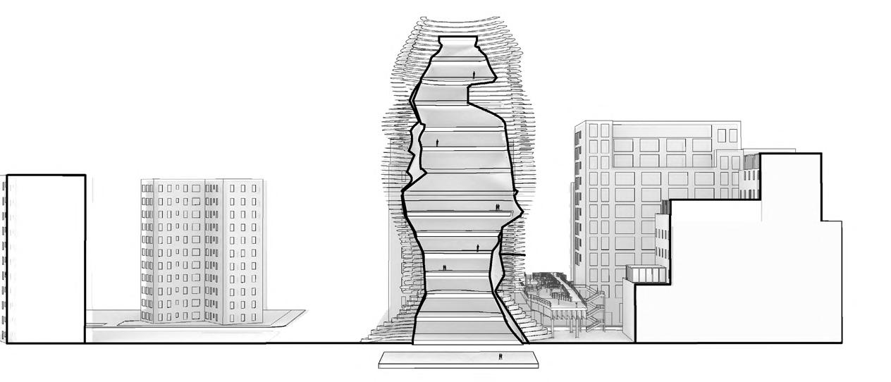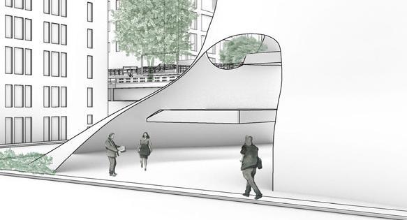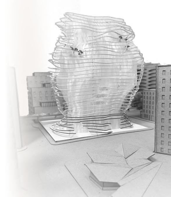 The plaza design is a “less is more” design in that it is not overly designed to allow the city to use the space however they like. The geometry of the building is carried onto the design of the plaza ground, using the striations to direct movement along the site. The scrim of the building works as public seating at the base that invites a spectator-spectacle realtionship. The scrim the space for spectators to stop and watch, with the open space housing pop-up events and all the street activities of NYC.