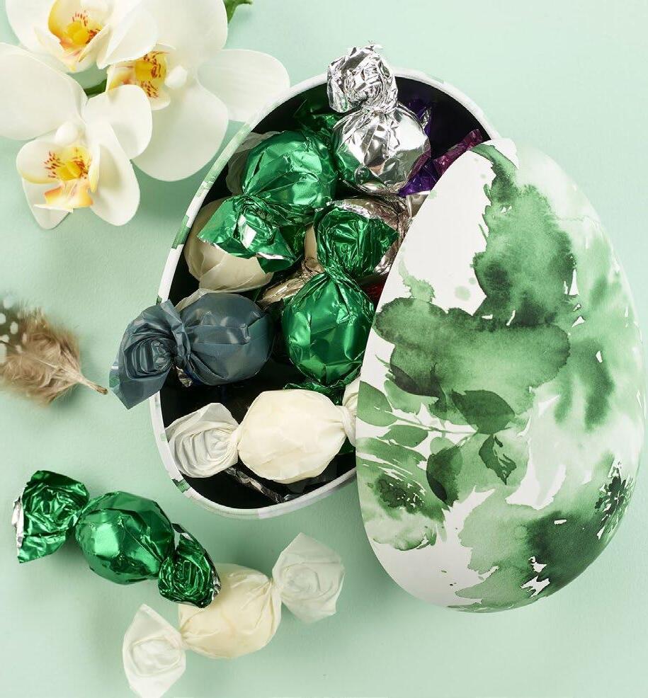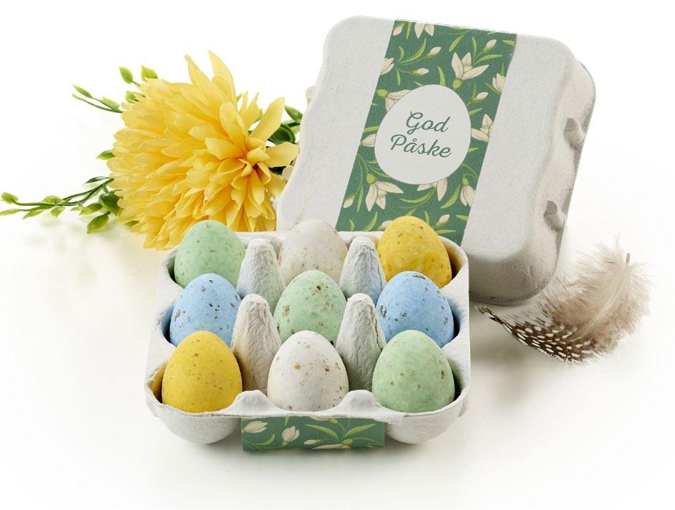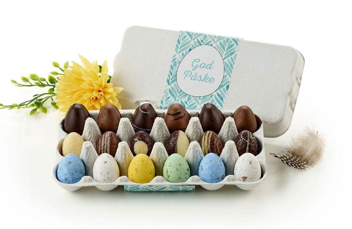 Äggkartong med blandade sorter av marsipanägg, mini lyxchokladägg och belgiska chokladägg.