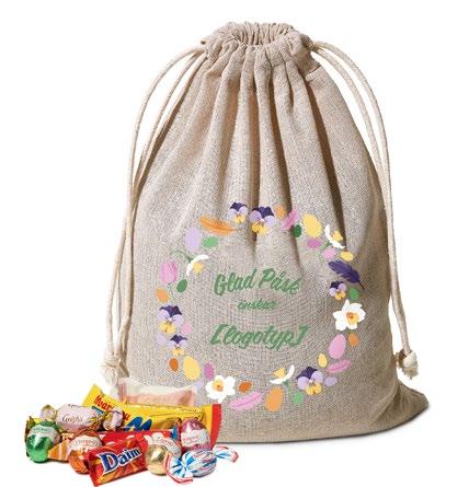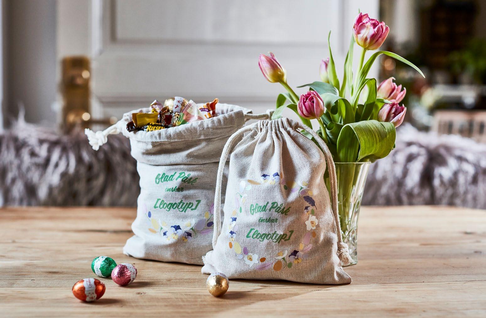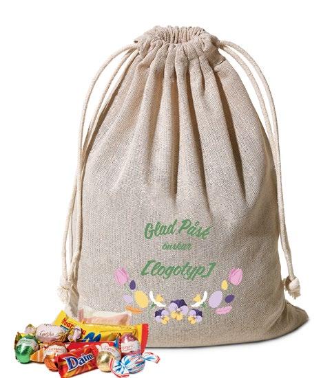 Vår omåttligt populära linnesäck fylls med en av våra Favoritmixar eller våra Påsk-praliner. Linnesäcken är en trevlig gåva i Tomtens anda som snabbt har blivit en av våra mest uppskattade produkter. Säckarna är tåliga och hållbara, och har GOTS- och GRS-certifiering. Välj till ett påskkort eller tryck på säcken.