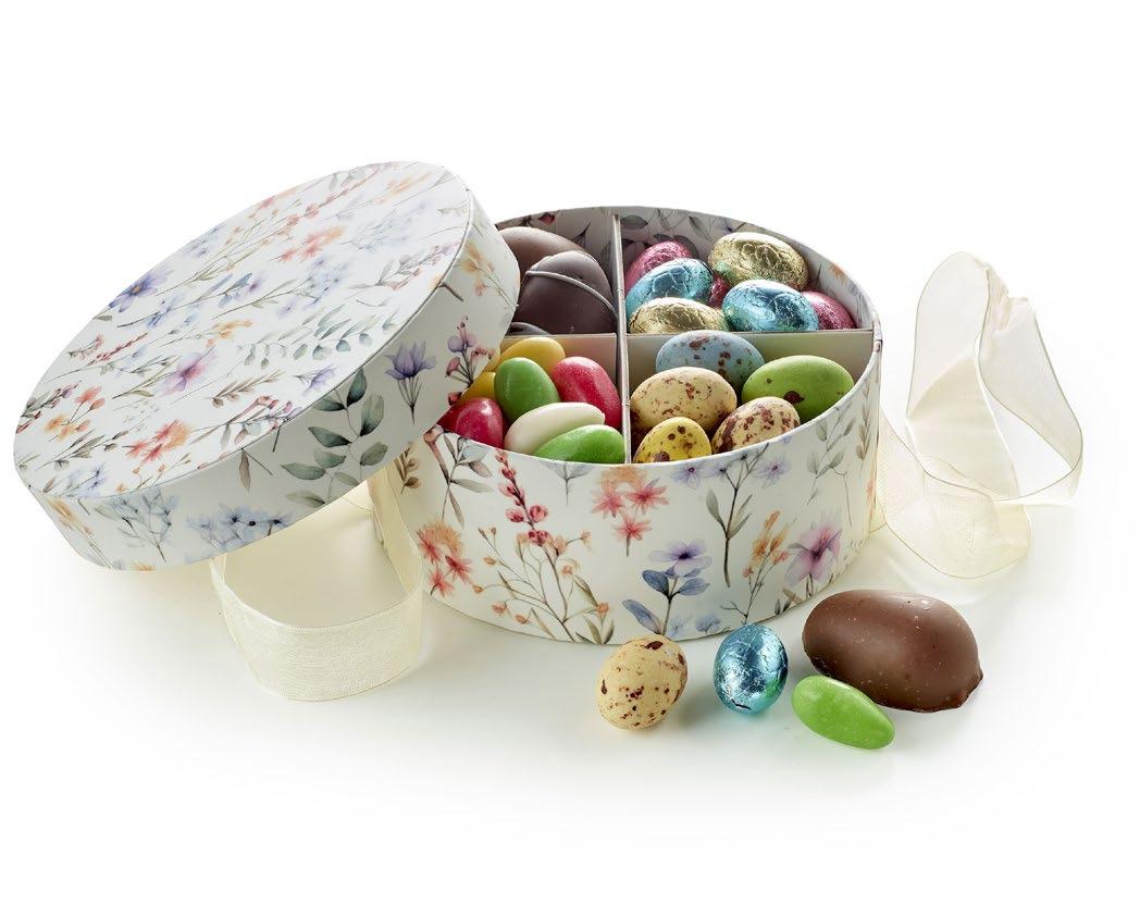 Rund hattask med familjemix innehållande marsipanägg, gourmetägg, pralinägg och dragéeägg. 400g