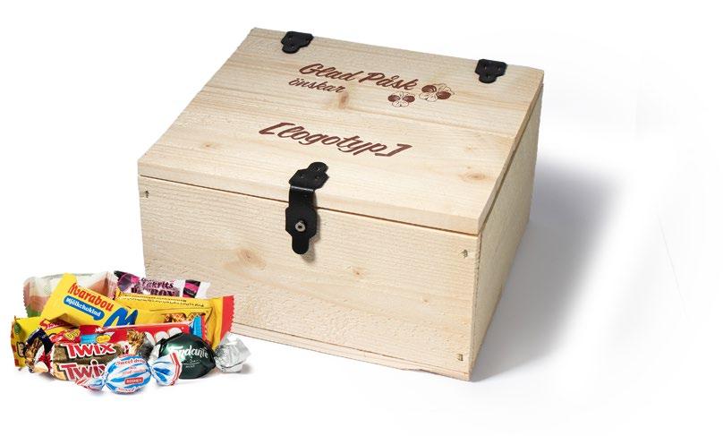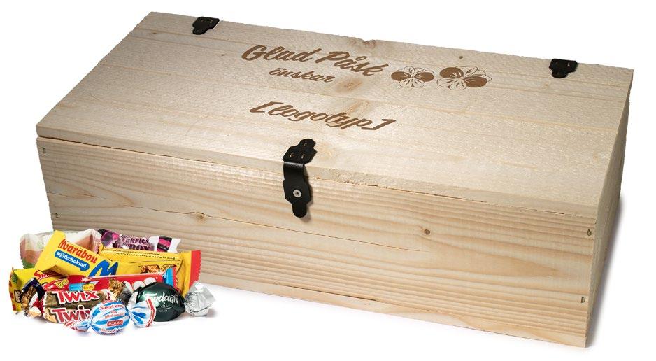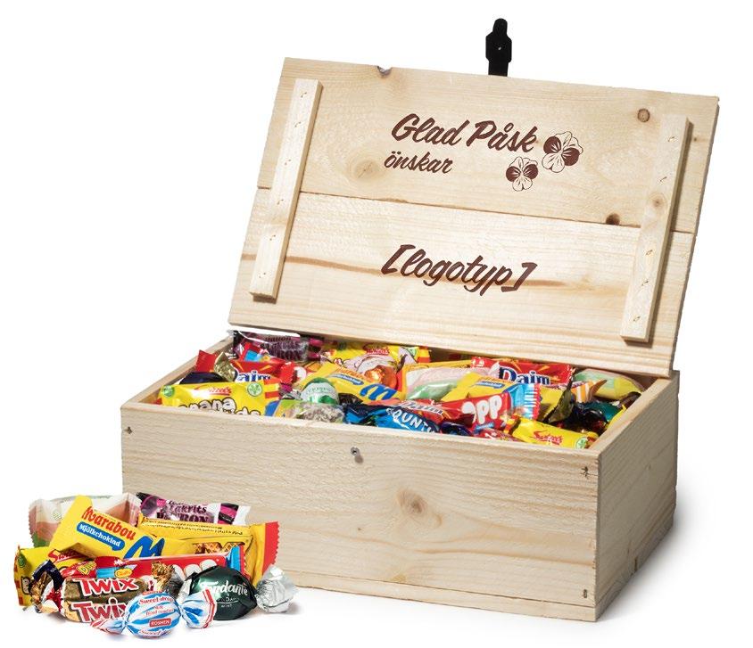 En påskgåva som blir vackrare med åren. Tröttnat på påskägg? Kanske är vår stabila handsnickrade trälåda med beslag av veganskt läder något för dig. Lådorna finns i tre olika storlekar och fylls med inslaget godis. Lådan åldras väl och passar perfekt som förvaring när godiset är uppätet. Vi föreslår att du förvarar mer godis. Trälådorna kan graveras med din logotyp och hälsning. Eller varför inte köpa till ett fint påskkort?