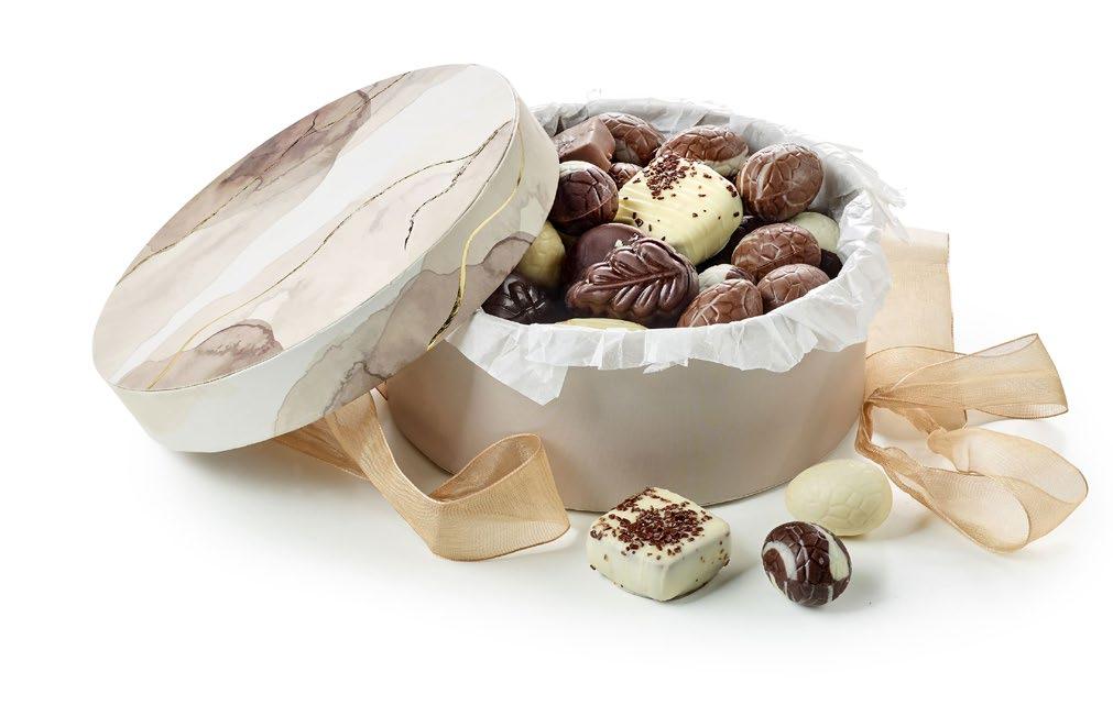 Rund hattask med mixade chokladägg. Marsipanägg, Belgiska chokladägg, pralinägg och gourmetägg. 500g
