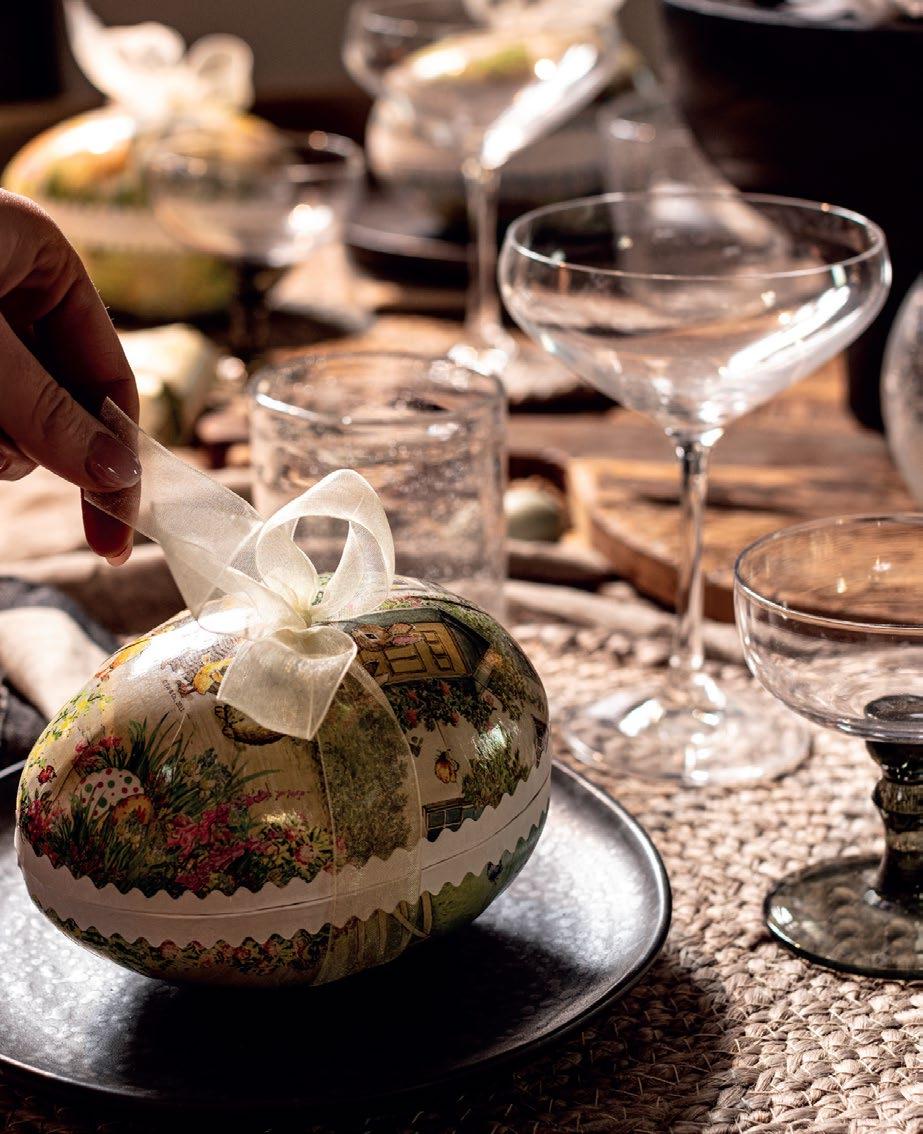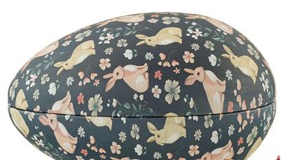 Vackert dekorerat plåtägg, inslaget i cellofan med en rosett Ägget är fyllt med en underbar påskmix från flera välkända varumärken.