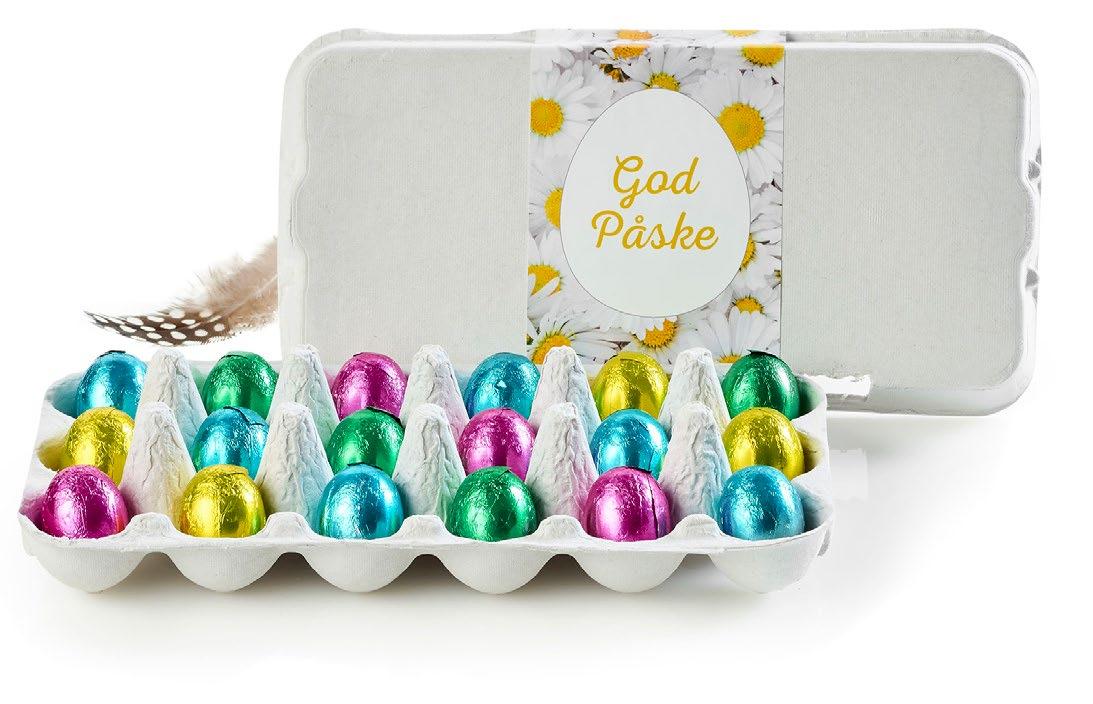 • Folierade påskägg choklad/nougat. Antal per kartong 5 st. Stl. 16x24,5 cm. Art 85105.
